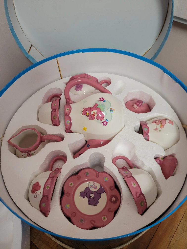 Care Bears Collectible Children’s Tea Set – Original Box Step back into childhood with this adorable Care Bears Tea Set, beautifully packaged in its original round storage box featuring Share Bear on the lid. A perfect collectible for fans of the beloved Care Bears, this set makes a delightful display piece or a sweet gift for someone who loves vintage-inspired treasures. ✨ Features: Complete miniature tea set (teapot, cups, saucers, plates, and more – see photos for exact contents) Comes in original decorative round Care Bears box with rope handle for easy carrying Cheerful, colorful artwork of the Care Bears on each piece Made from durable ceramic/porcelain Great for display, gentle play, or gifting 🧸 Condition: Pre-owned and in very good condition. Pieces are intact with bright colors, and the original box is included (shows light wear consistent with age). Please see photos for details – what you see is exactly what you’ll receive. 🎁 Perfect For: Care Bears collectors 80s/90s nostalgia lovers Children’s tea parties Display in a collection or curio cabinet