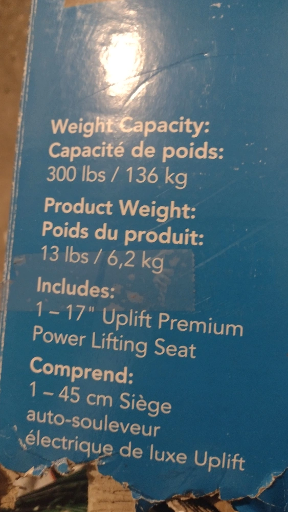Selling a Carex Uplift Premium Power Lifting Seat. It helps keep you active and independent. The weight capacity is 300 lbs / 136 kg. Product weight is 13 lbs / 6.2 kg. Includes 1 - 17" Uplift Premium Power Lifting Seat