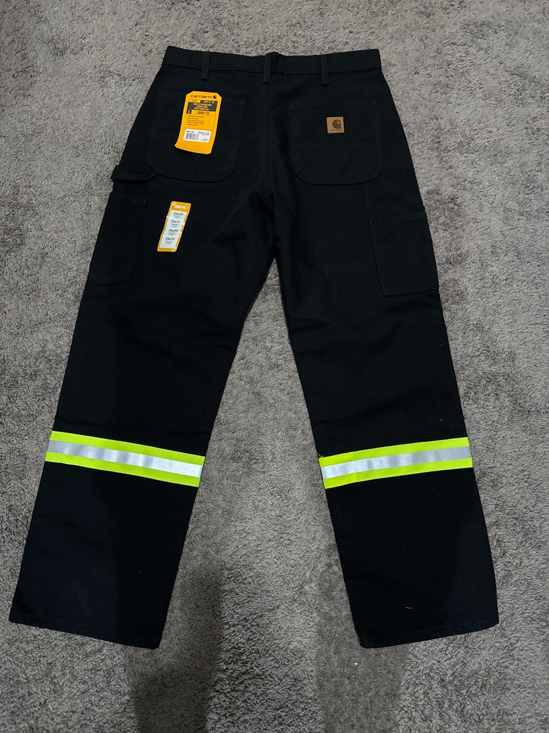 60Selling a pair of Carhartt BN0111-M work pants in size 34x30. These are loose fit and flannel lined, perfect for cooler weather. They feature multiple tool and utility pockets for convenience. The pants also have reflective stripes near the ankles for added visibility. A great and durable pair of pants for work or casual wear!