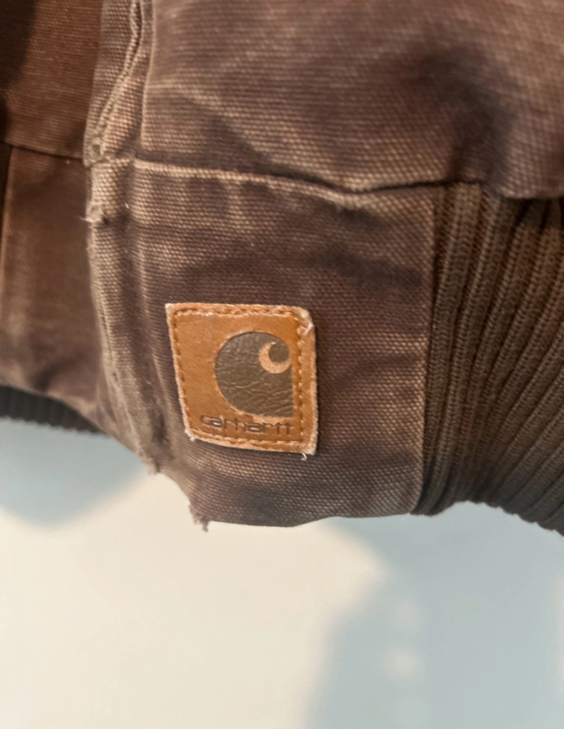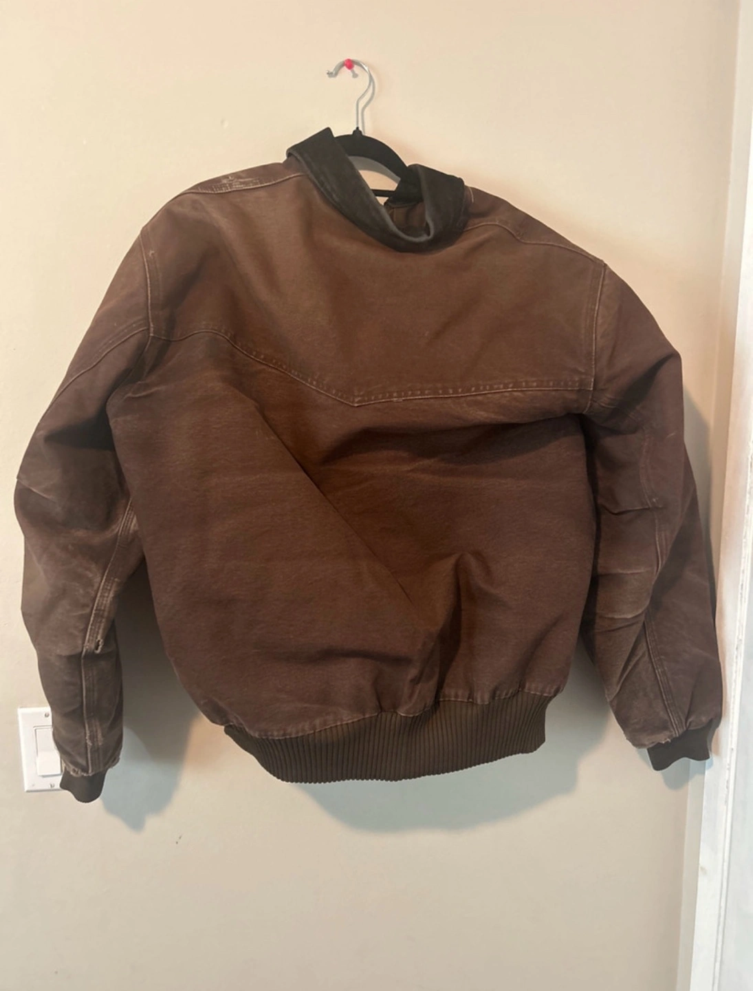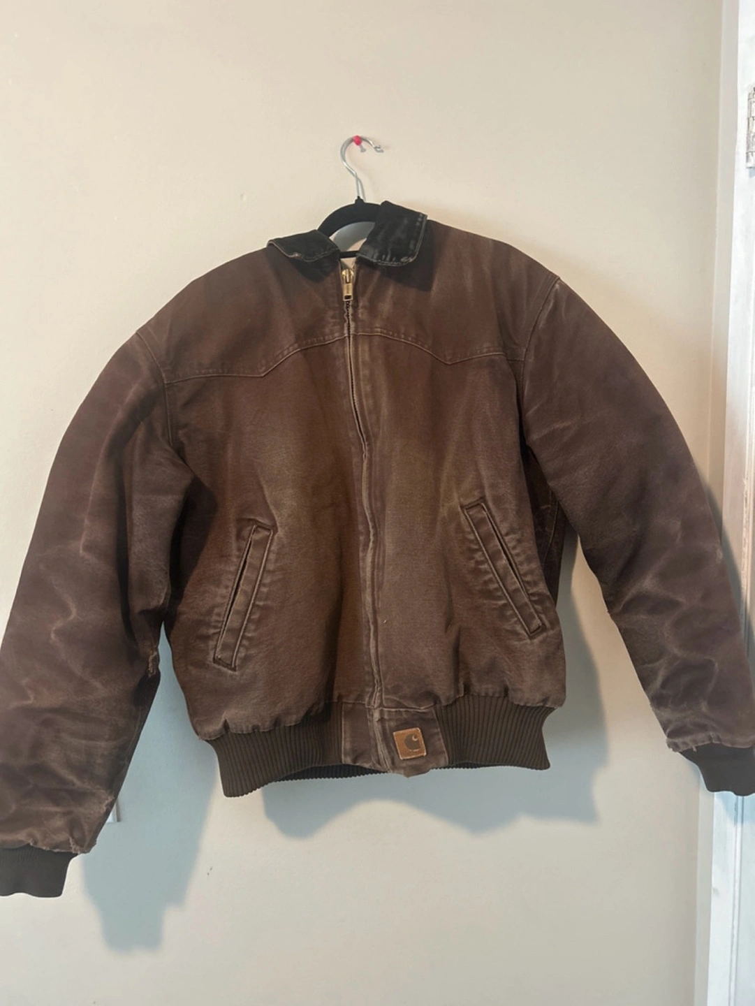 18Brown Carhartt jacket with black collar. Zipper closure. Ribbed cuffs and waistband.