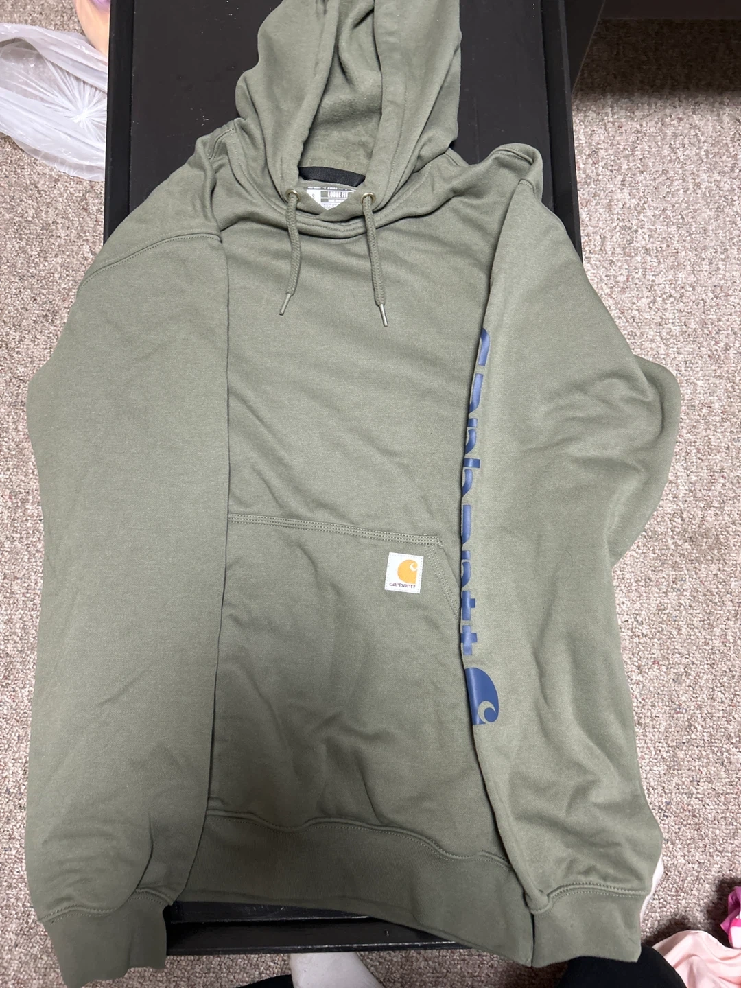 Selling a Carhartt hoodie in olive green! It's in great shape and ready for a new home. The Carhartt logo is on the front pocket and down the sleeve. Perfect for staying cozy! Has never been worn however tags are removed!