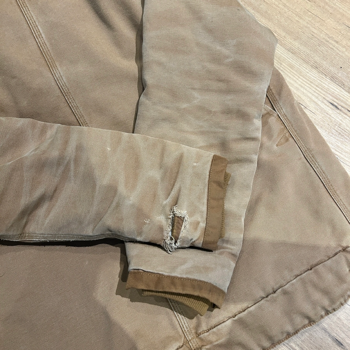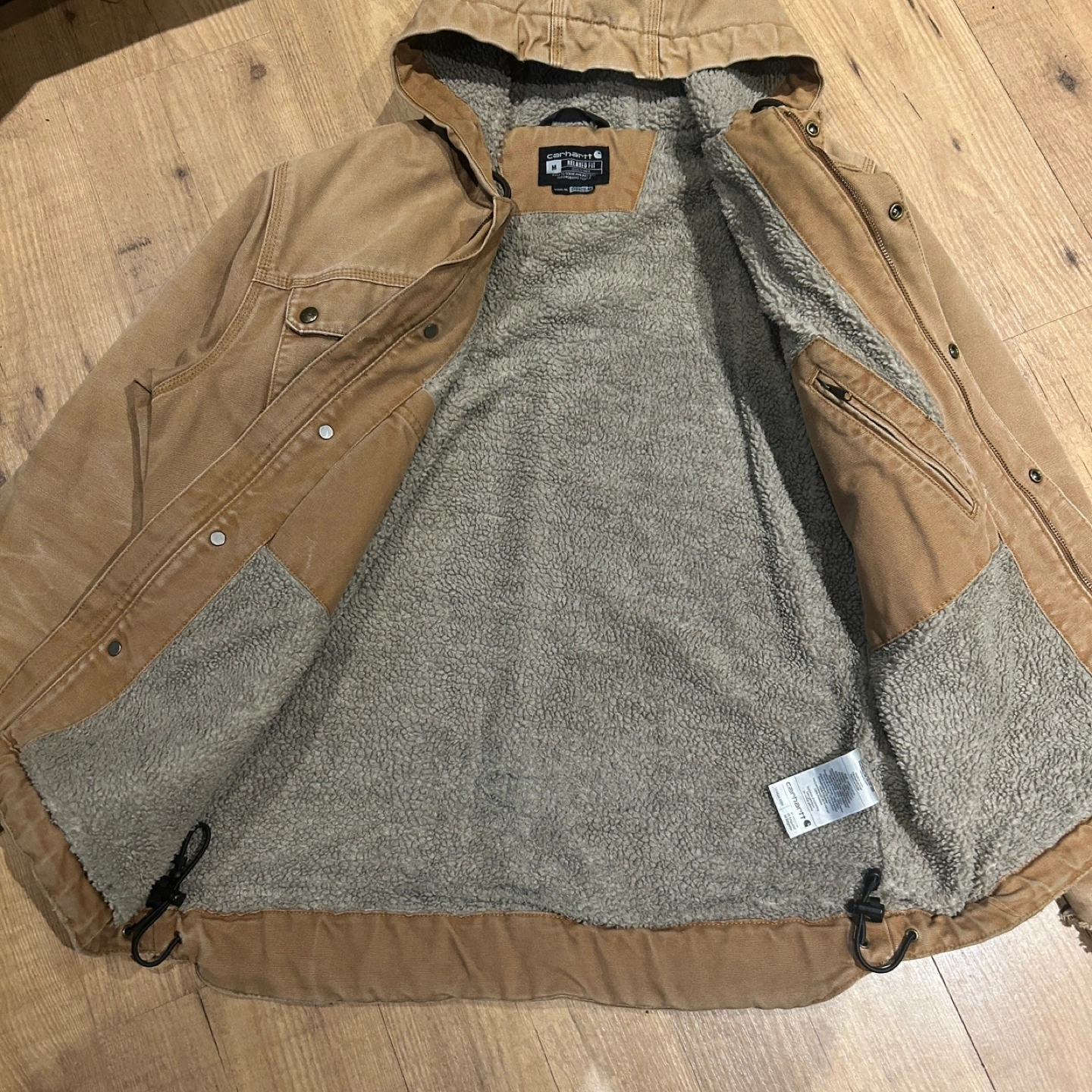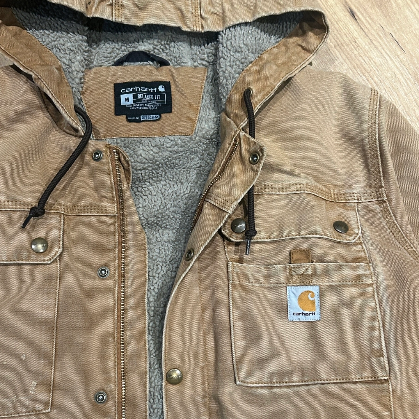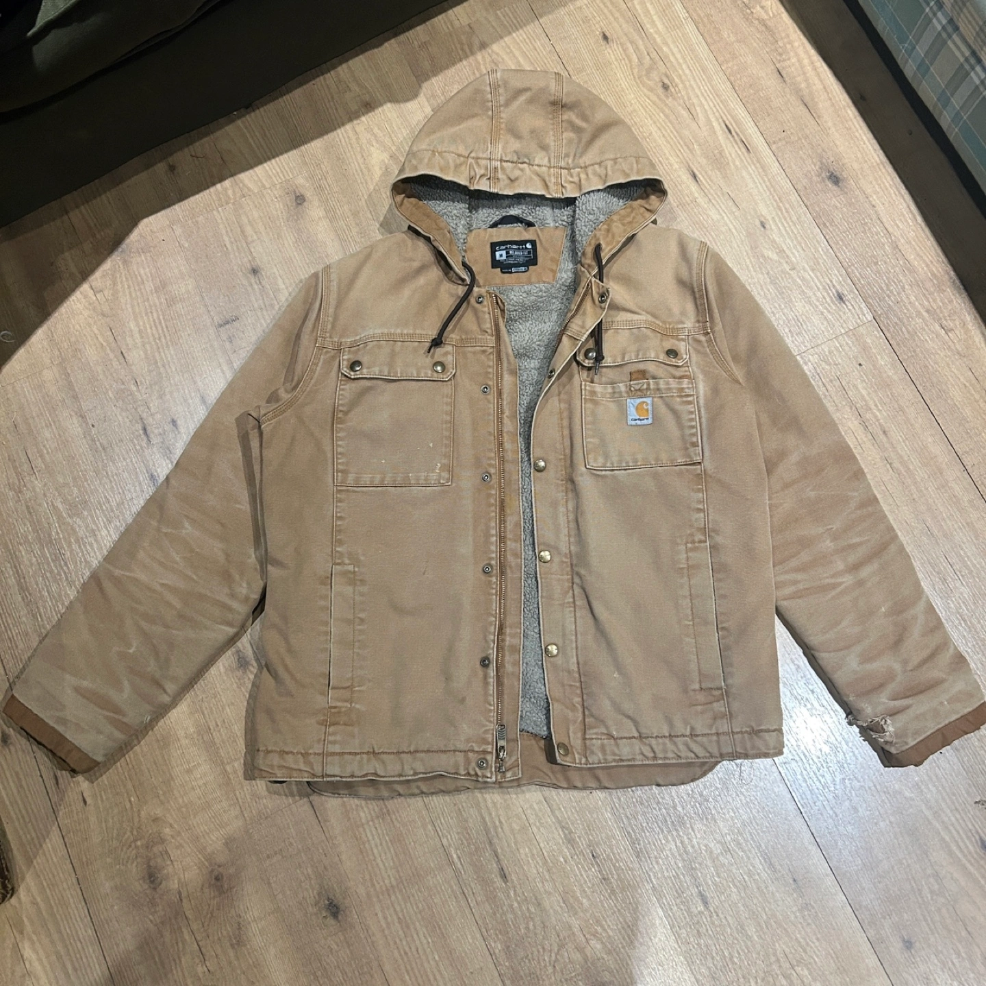 33Men's Carhartt brown canvas hooded jacket. Relaxed fit. Size Medium. Fleece lining. Some wear and tear. Multiple pockets.