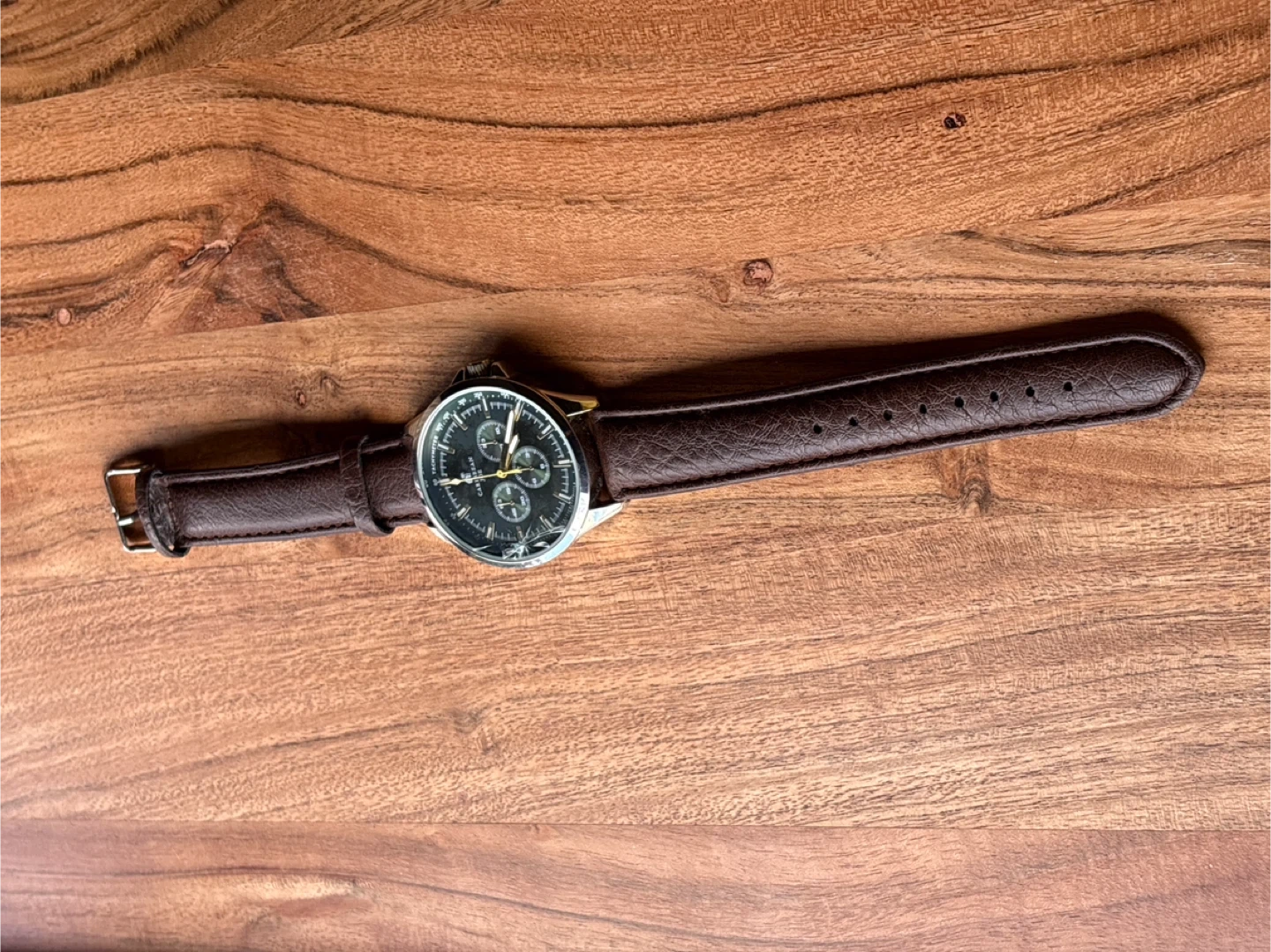 65Selling a Caribbean Joe watch with a brown leather band. It has a stylish chronograph face and is in good condition besides a small crack Perfect for everyday wear!
