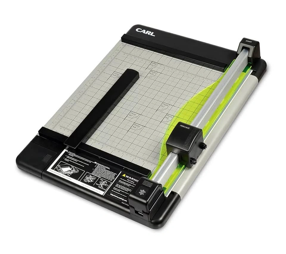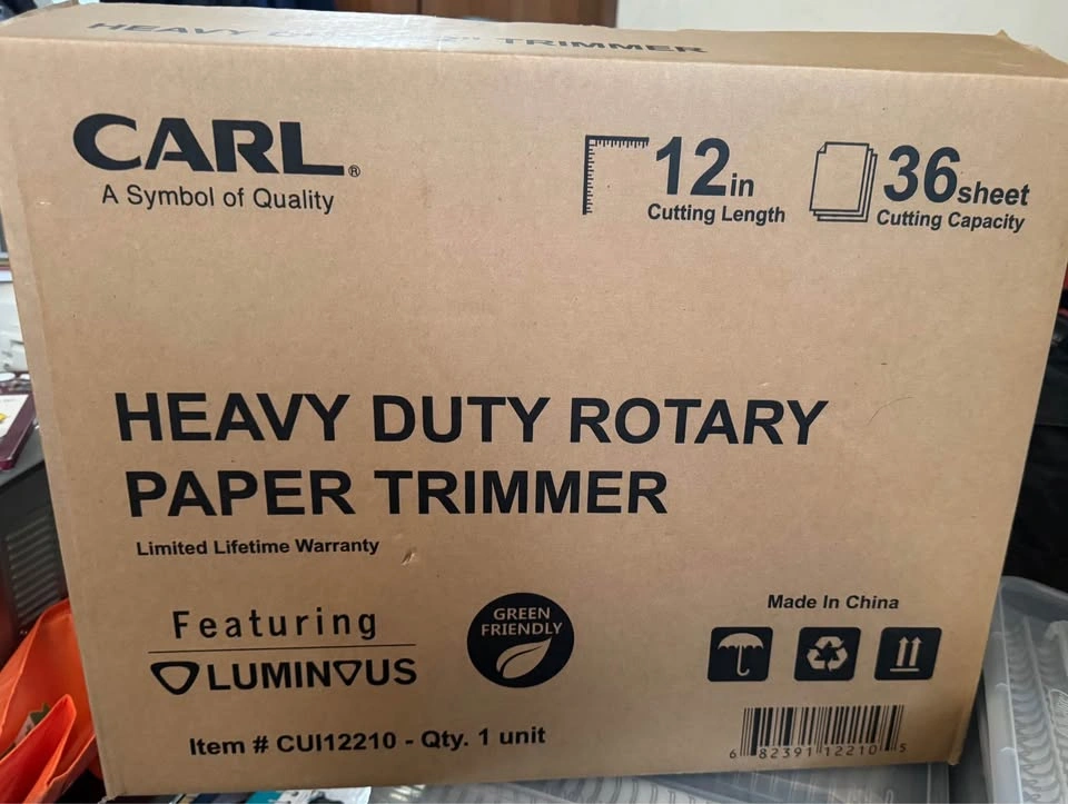 19Carl Heavy Duty 12” Rotary Paper Trimmer: • Green-friendly paper trimmer • Adjustable magnetic paper guide hold materials on a calibrated sturdy metal base board • Handy storage compartment for extra blades and cutting mats • Limited lifetime warranty-excluding blade and cutting mat • Adjustable magnetic paper gauge is great for making repetitive cuts Brand New in box. Never used. Amazon Listed at $242.00