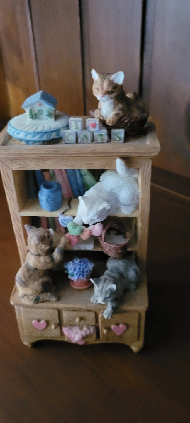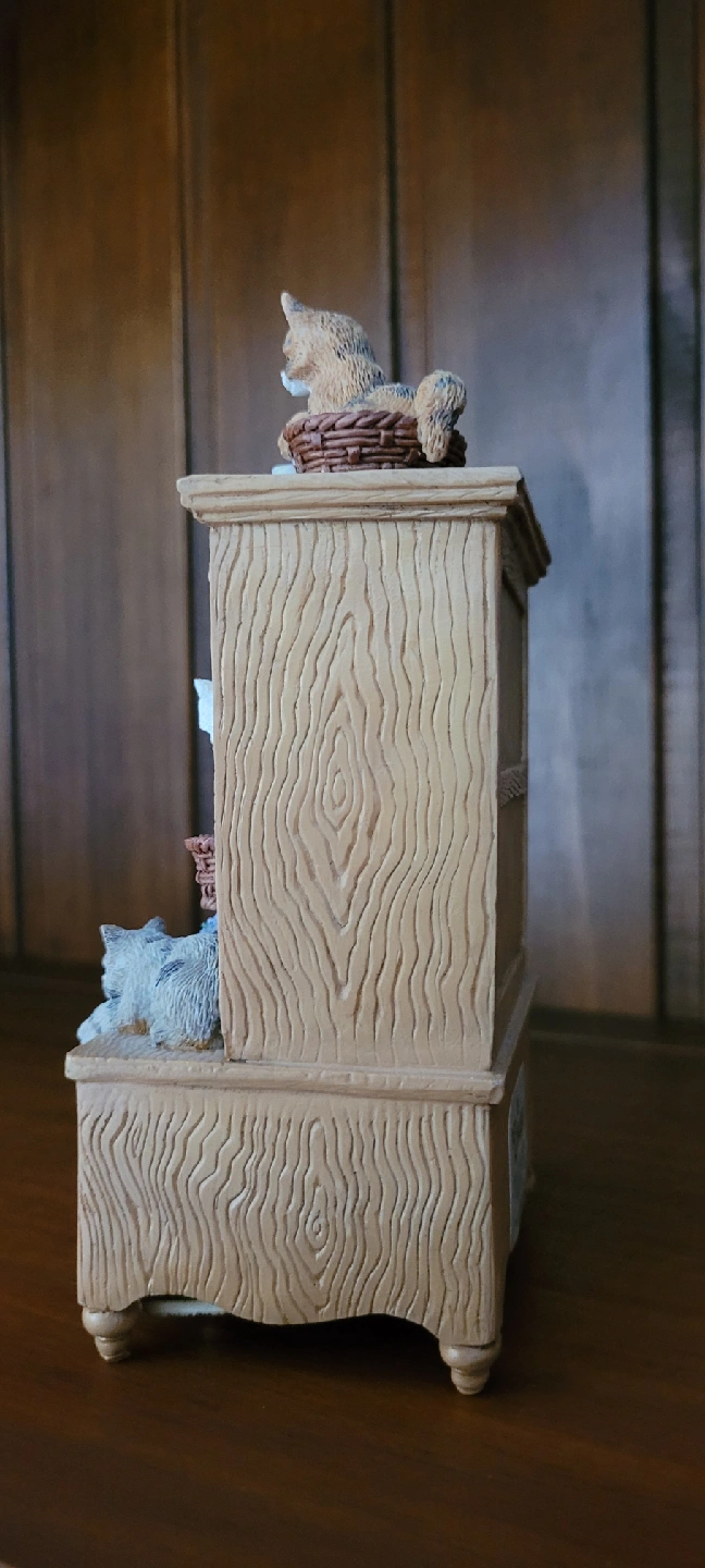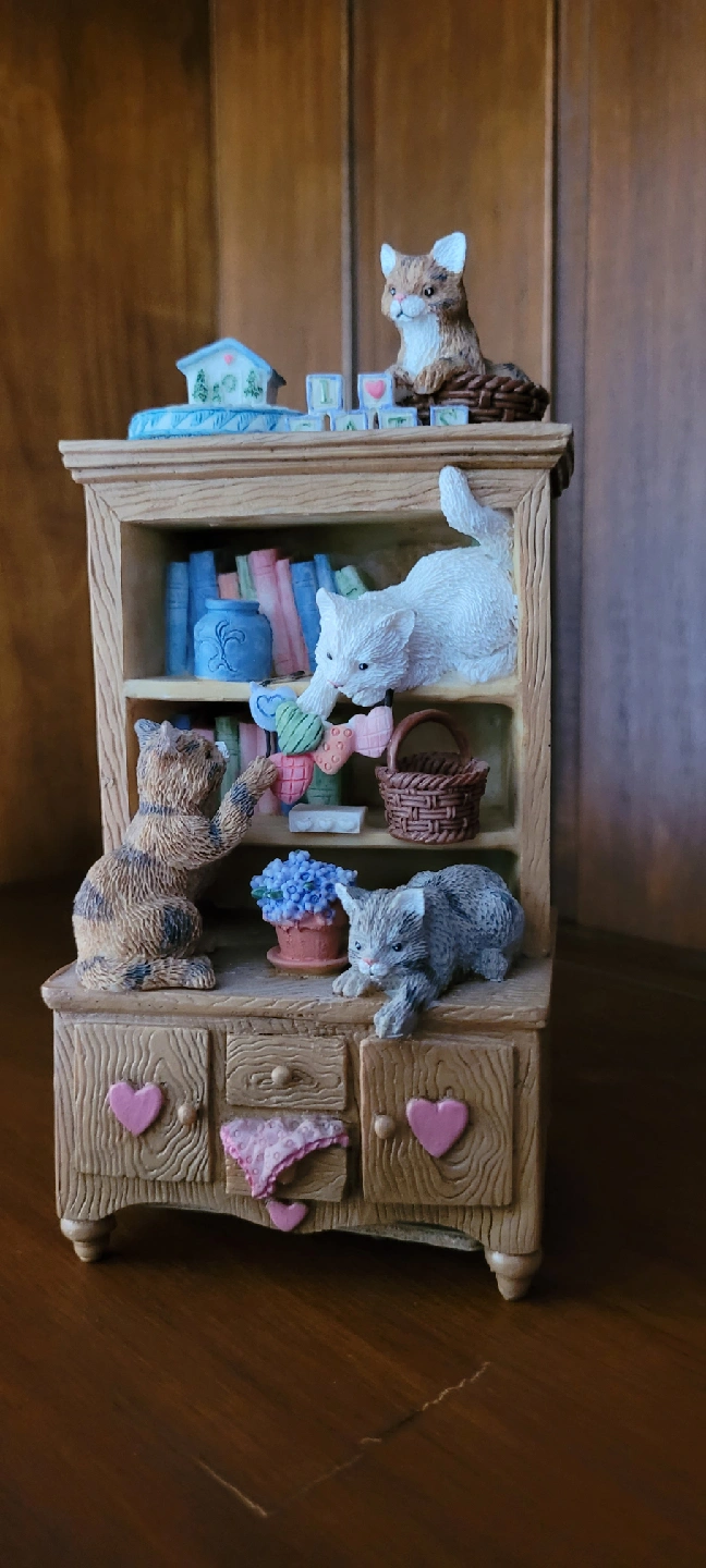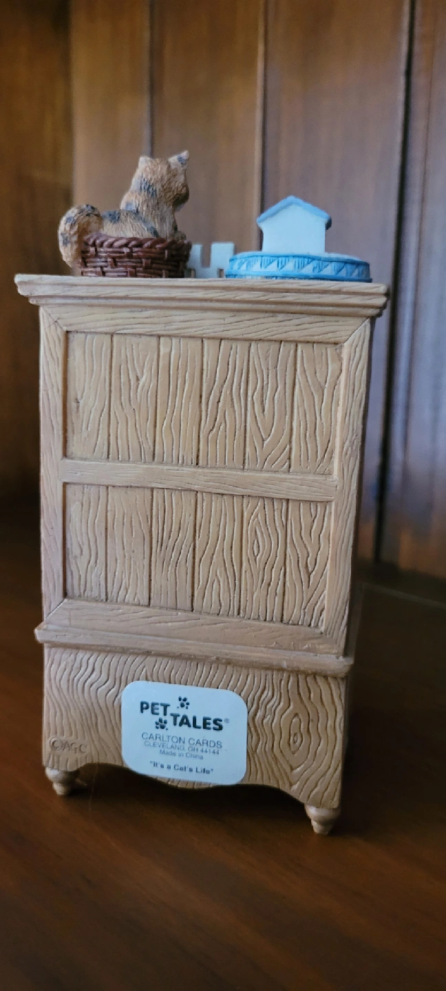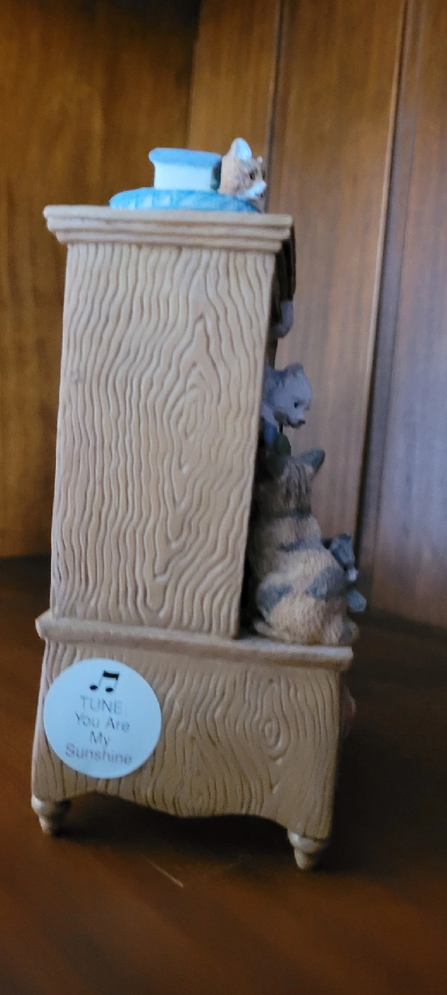 This is a cute 'It's a Cat's Life' figurine from Carlton Cards Pet Tales. It features a cabinet with several cats playing around it. The tune is 'You Are My Sunshine'