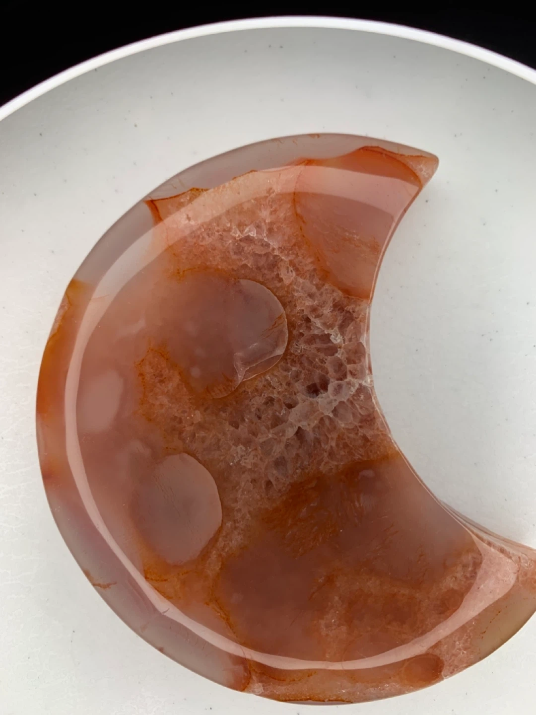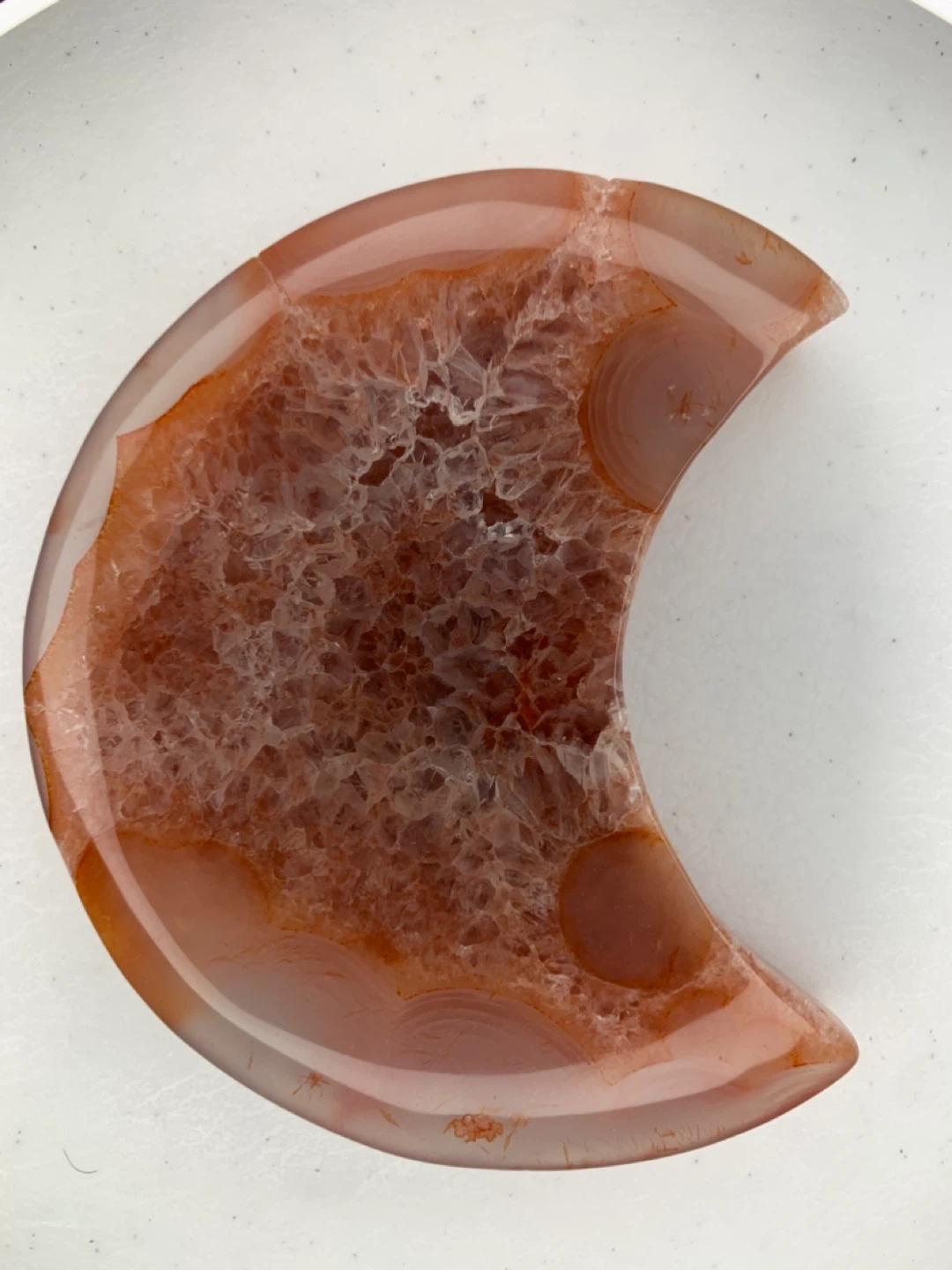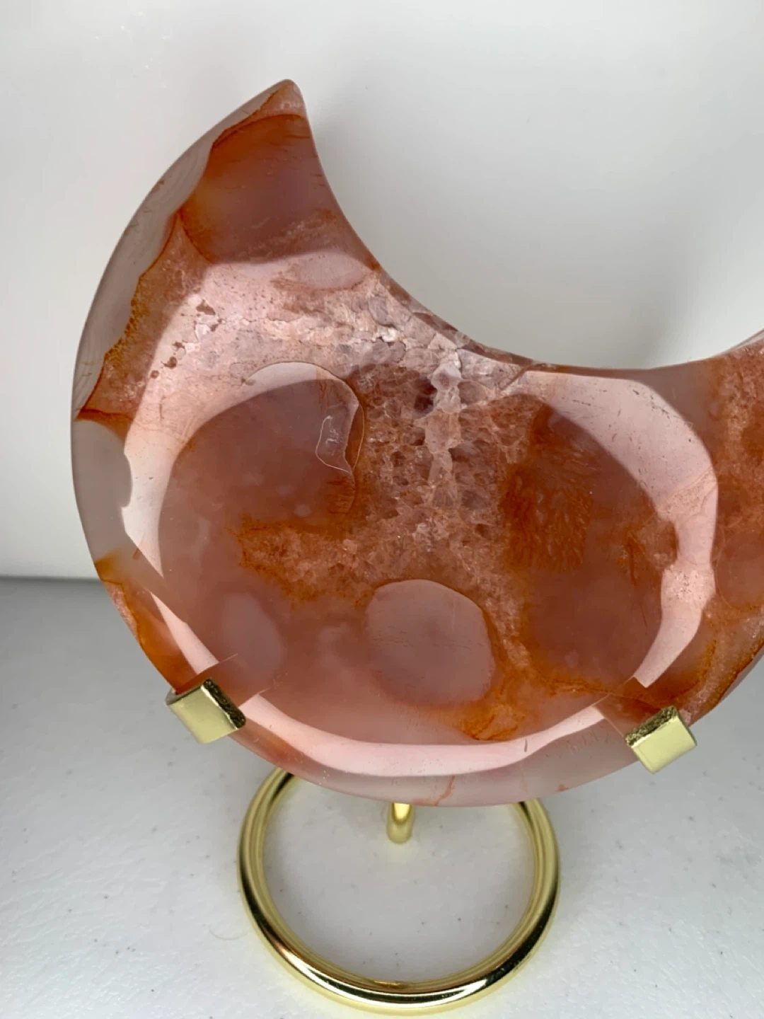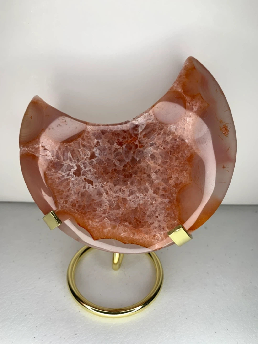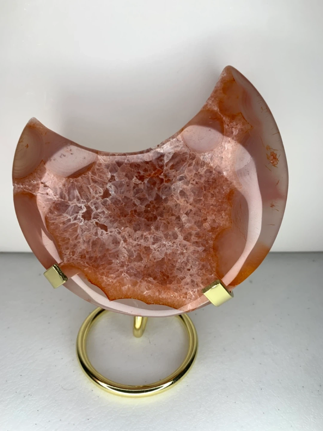 This is a beautiful agate crystal slice in a crescent moon shape! It comes with a gold stand, perfect for displaying on a shelf or desk. The agate has lovely reddish-brown tones and a unique crystalline pattern inside