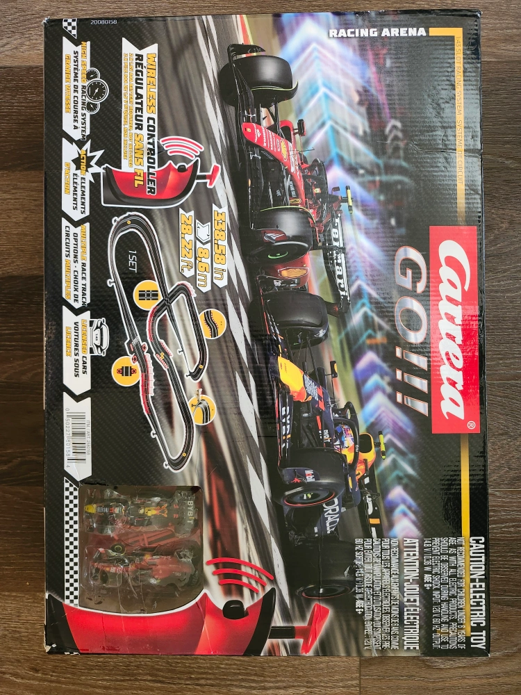 60Selling a Carrera GO!!! Racing Arena slot car set. Features: - Electric powered - Multiple track layout options - Includes two cars and two speed controllers - Track length is 8.6m (28.2x4.76ft) with a size of 250 x 145 cm (820x476 ft) - Recommended for ages 6+