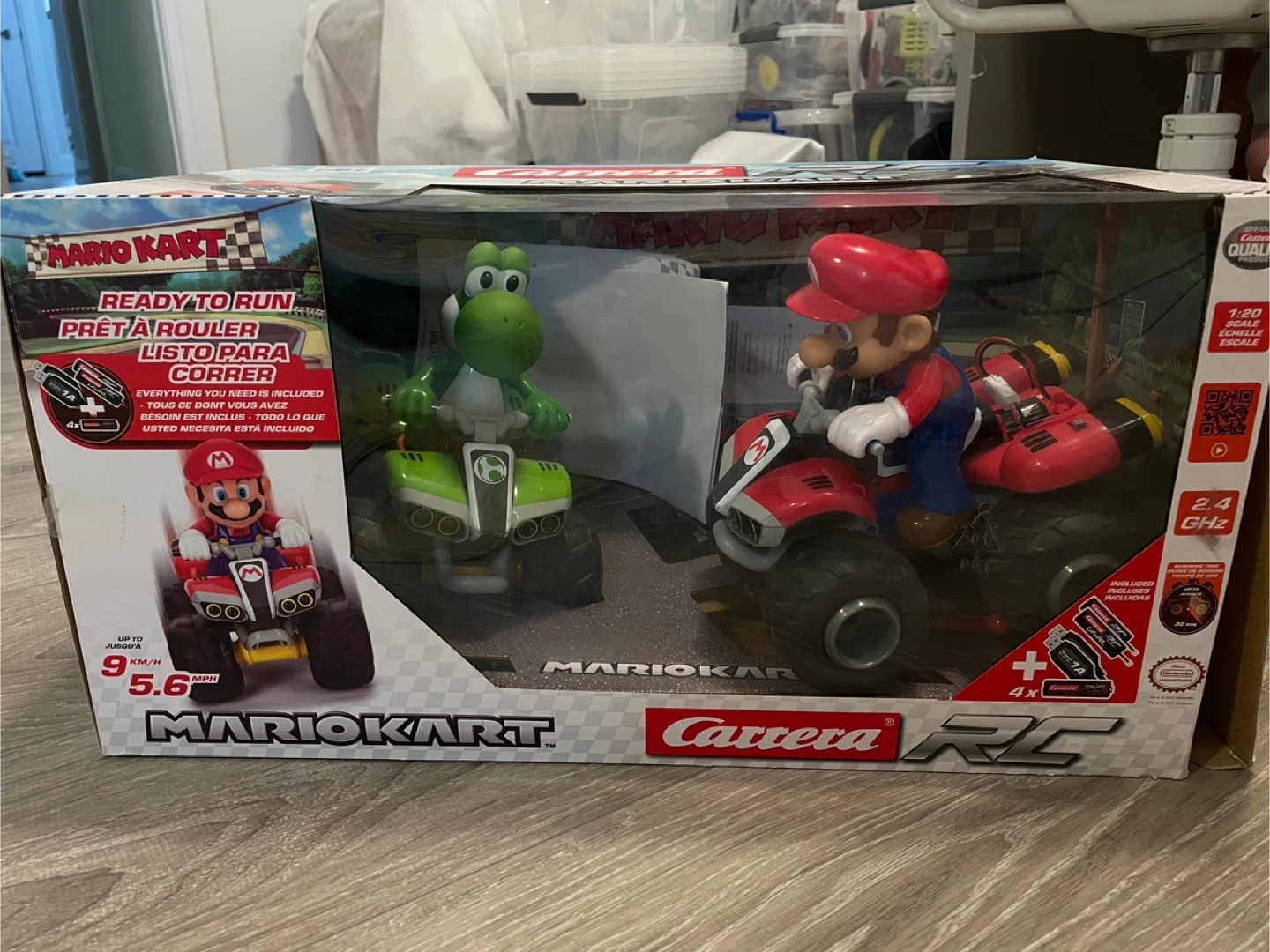 Get ready to race with this Carrera Mario Kart RC set! It comes with Mario and Yoshi on their ATVs, ready to go right out of the box. The set includes two remote controls for head-to-head action. It's in great condition and comes with the original box