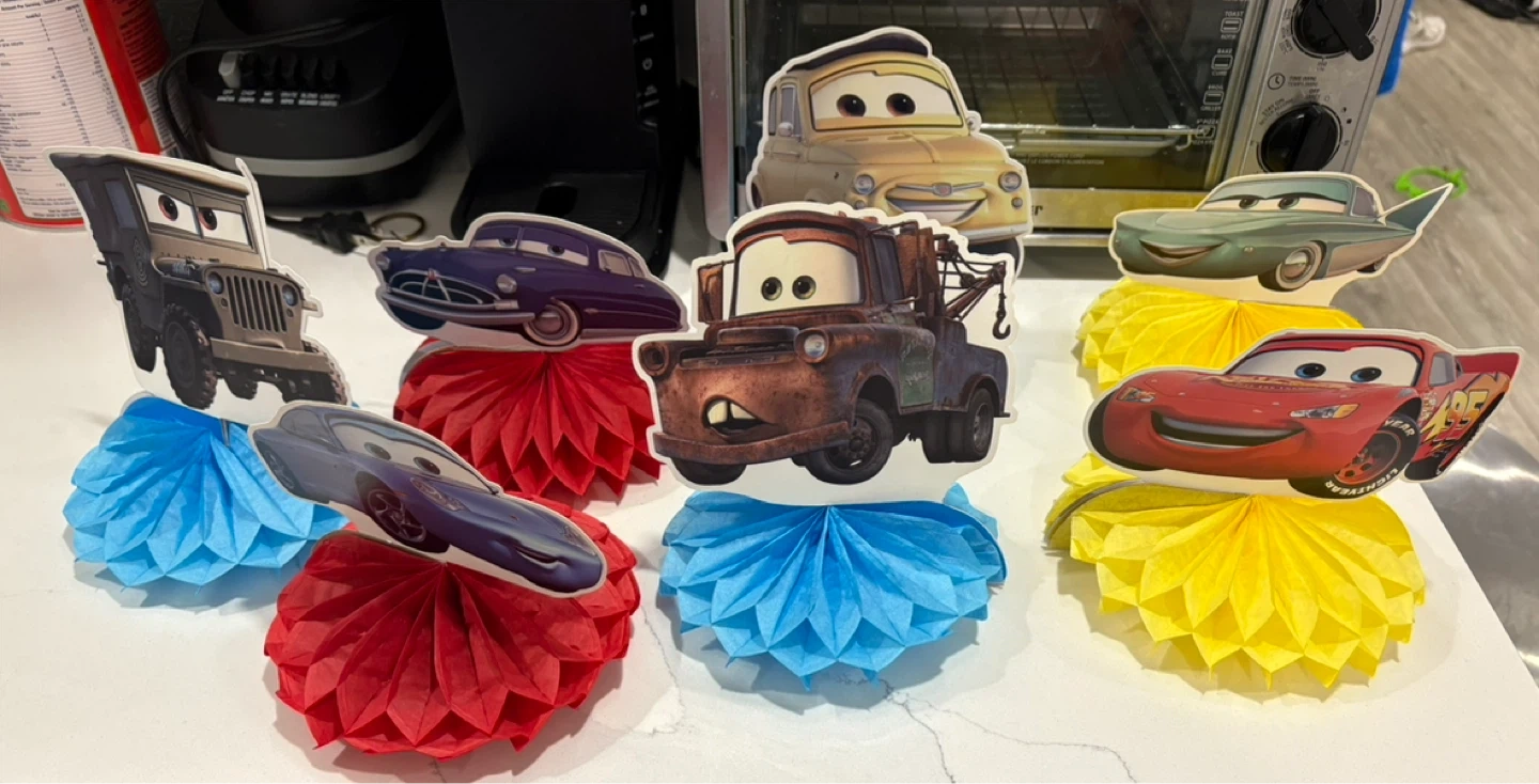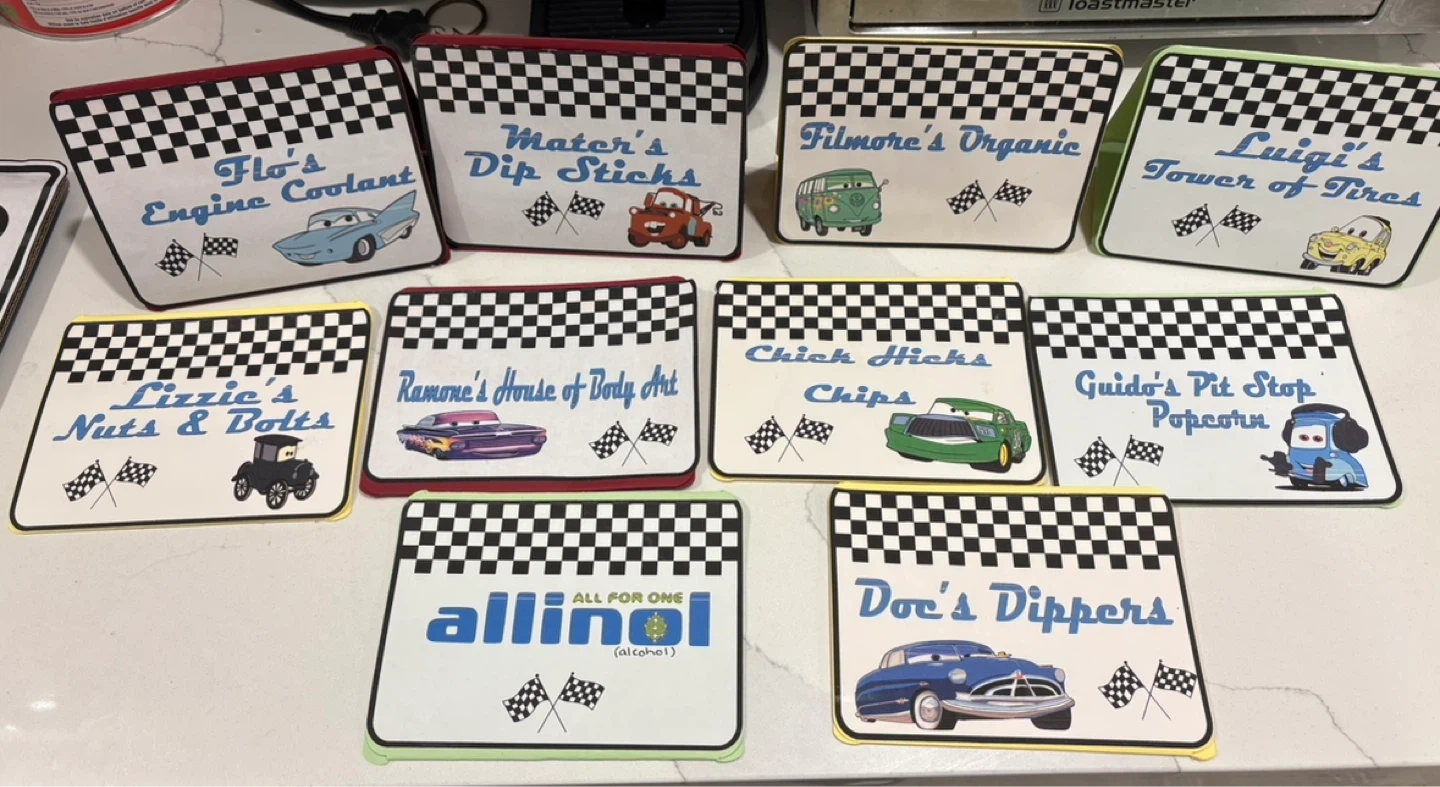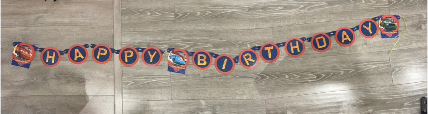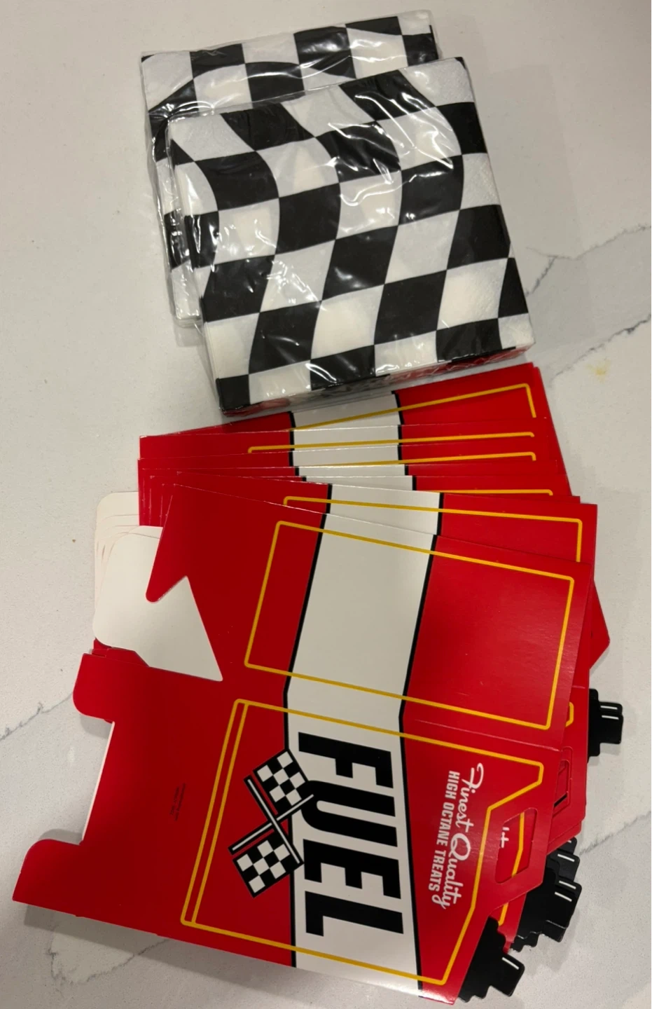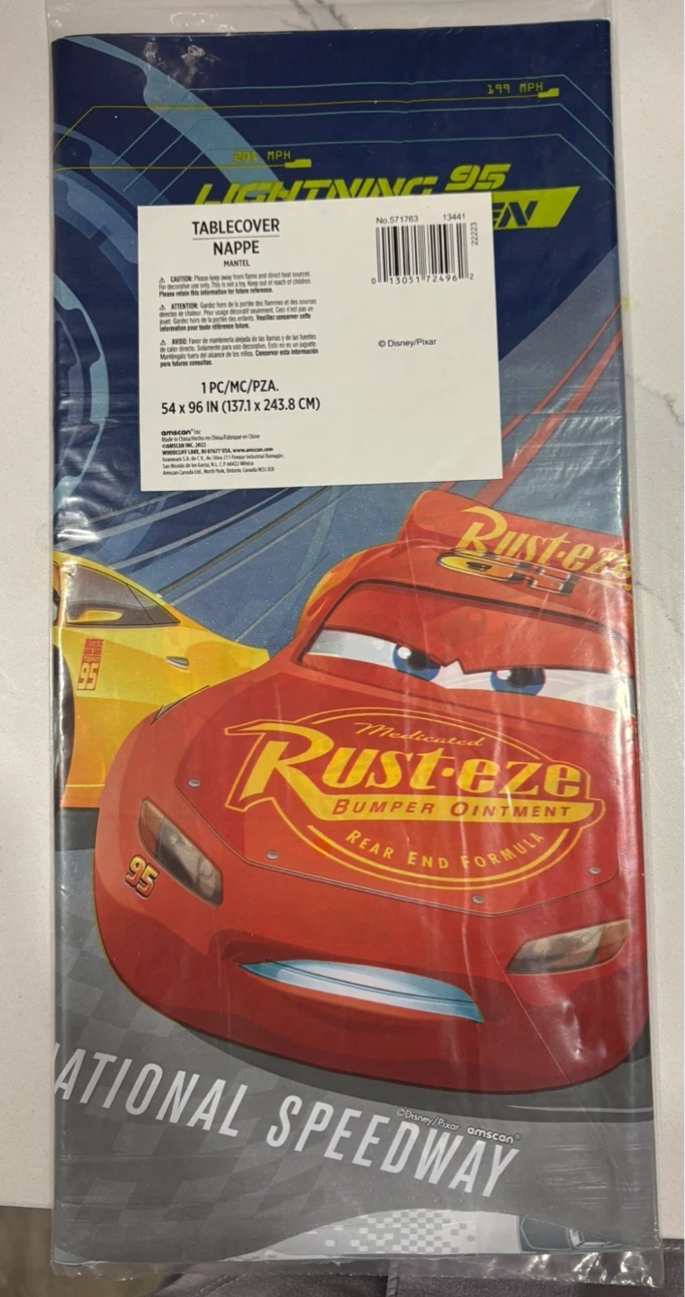 21Disney Cars themed birthday party. Includes: - Road runner decorations - Tablecloth (54 x 96 in) - Disney Cars character decorations - Happy Birthday banner - Traffic light decoration - Candle - Balloons - Napkins - Loot Bags - Checkered Flags Take in consideration that this is used. Only the tablecloth and the napkins are new.