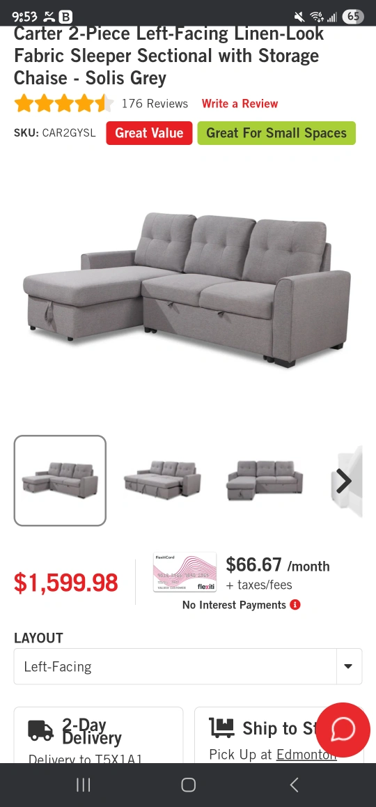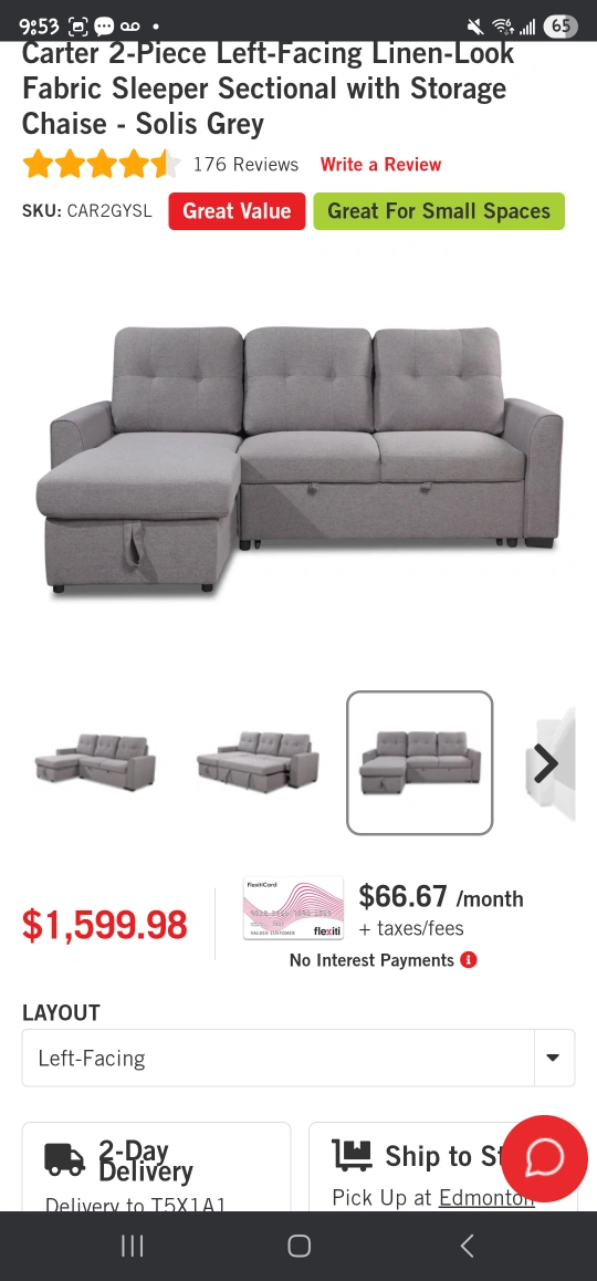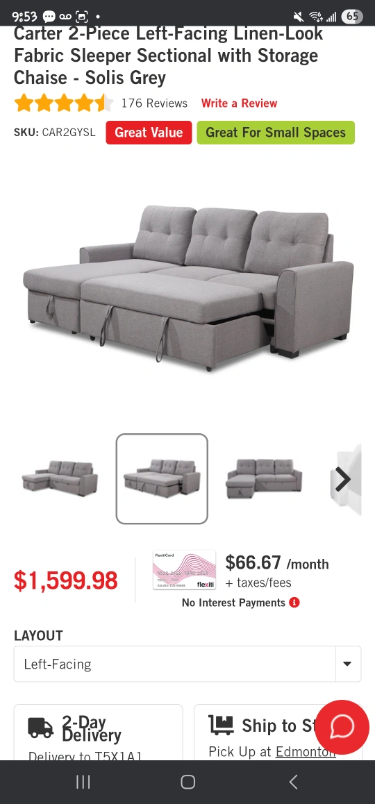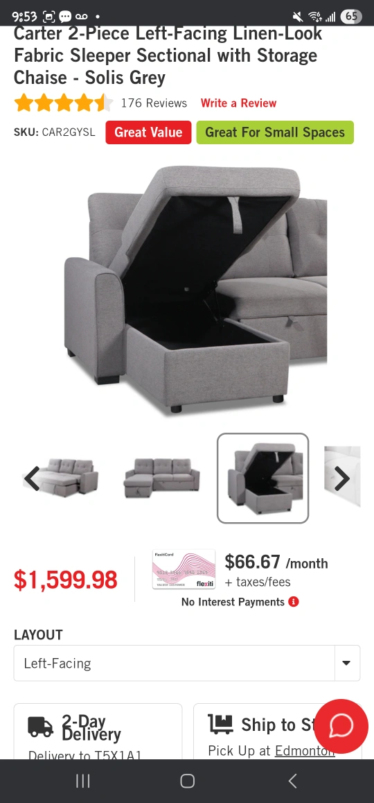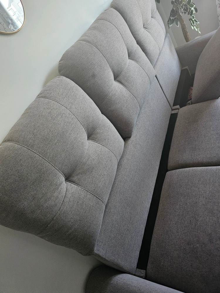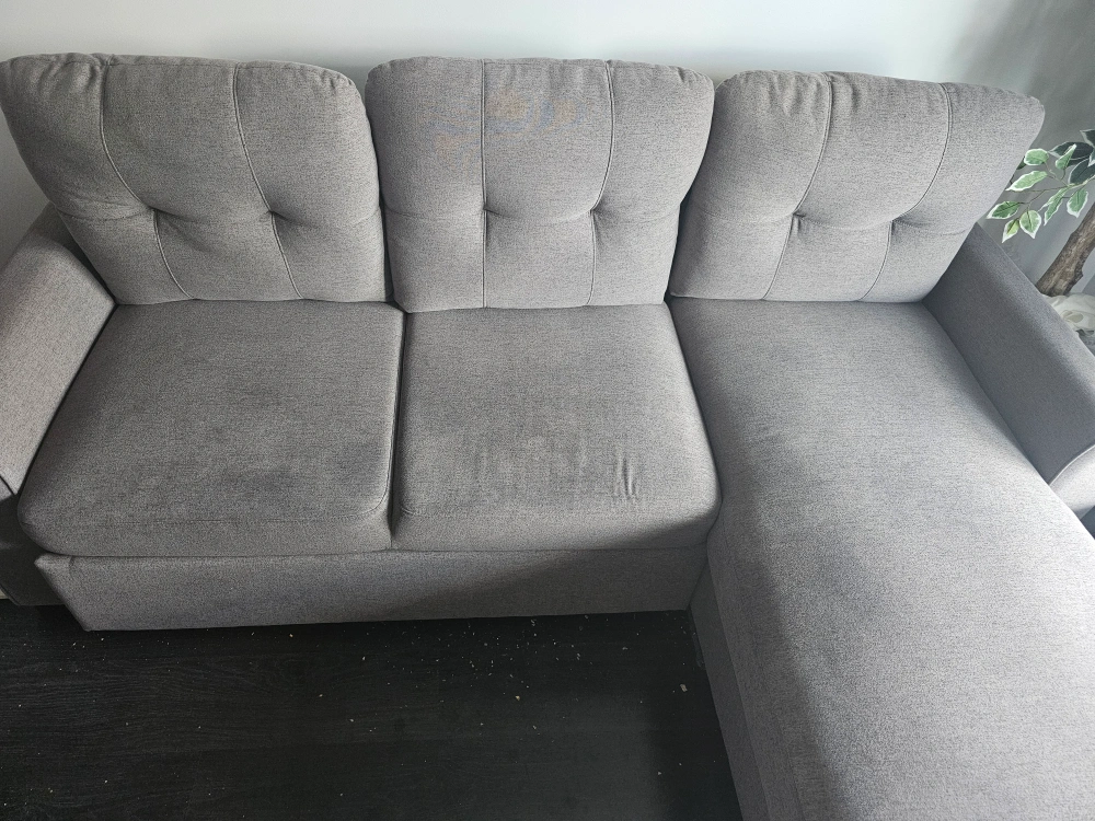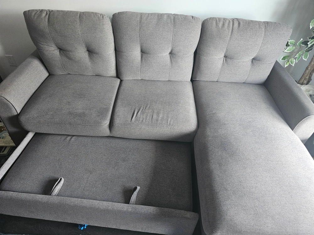 Selling a Carter 2-Piece Left-Facing Linen-Look Fabric Sleeper Sectional with Storage Chaise in Solis Grey. It's in great condition and offers a lot of value for small spaces. This sectional has a convenient storage chaise and pulls out into a sleeper.