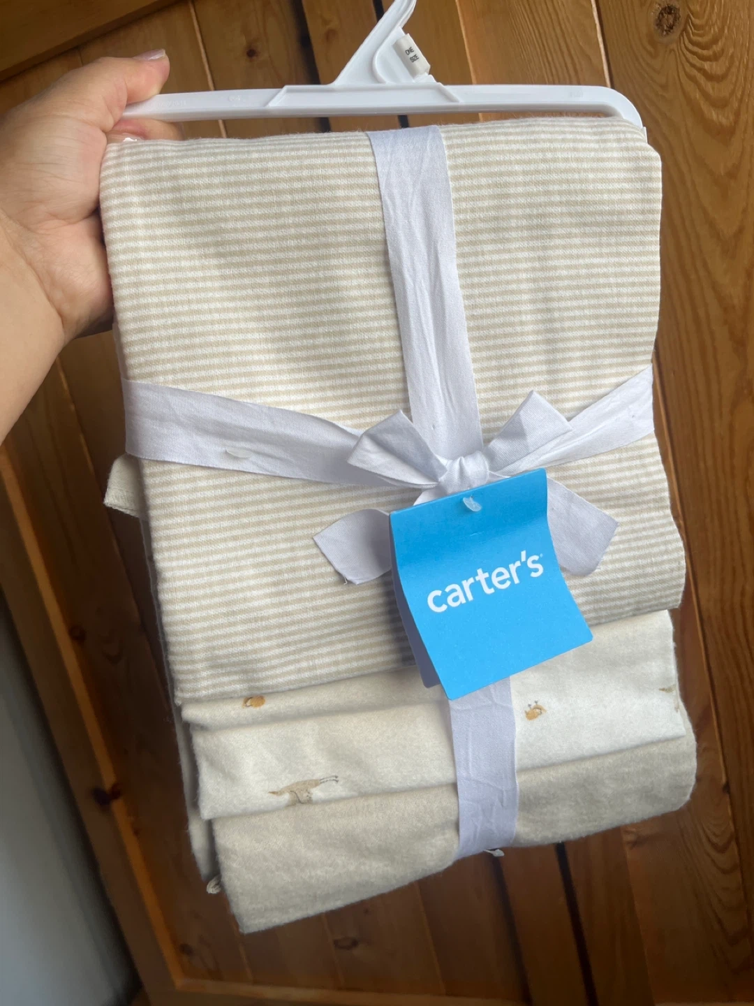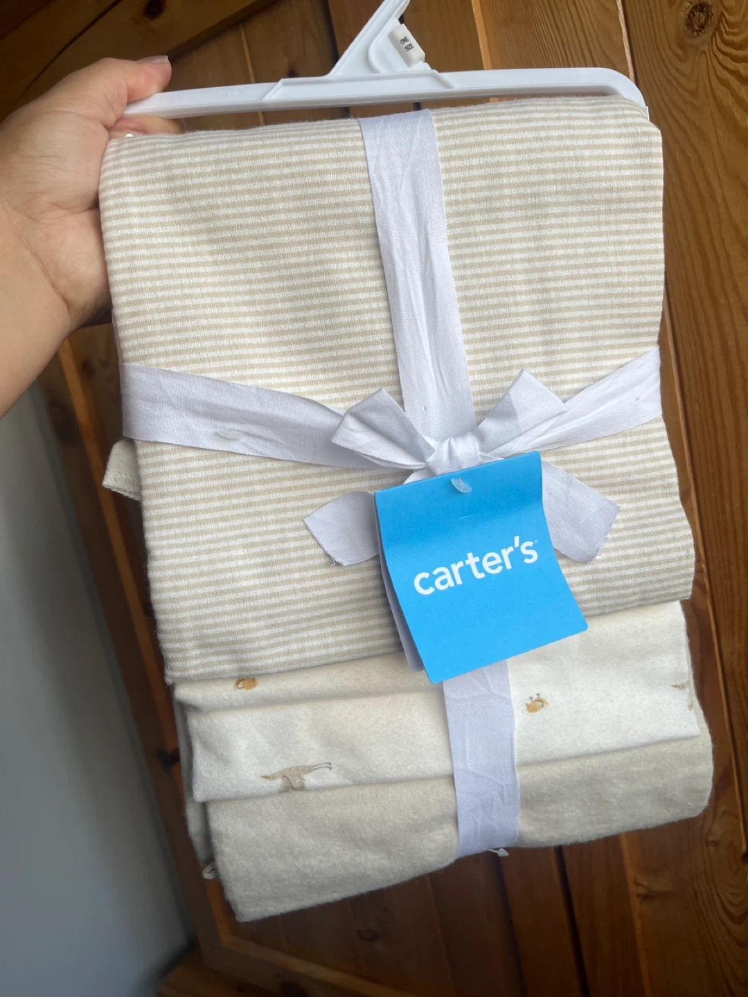 15Selling a brand new Carter's baby blanket set! The set includes two soft and cozy blankets, perfect for keeping your little one snug. One blanket features a cute pattern with little animals, and the other has a classic striped design. They're made of soft material and are great for swaddling or tummy time