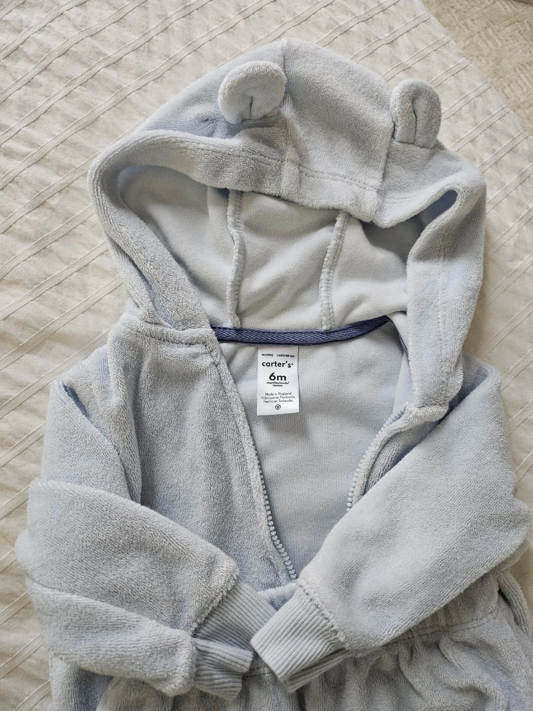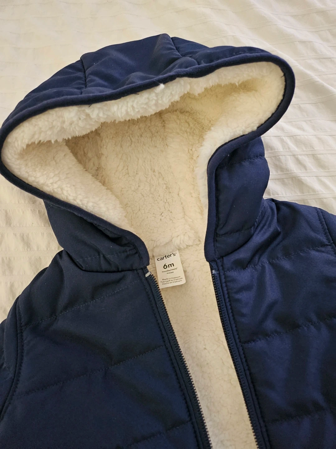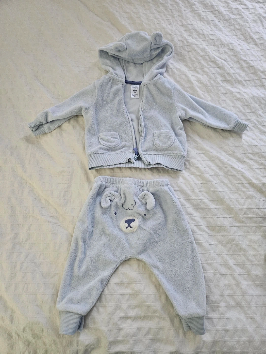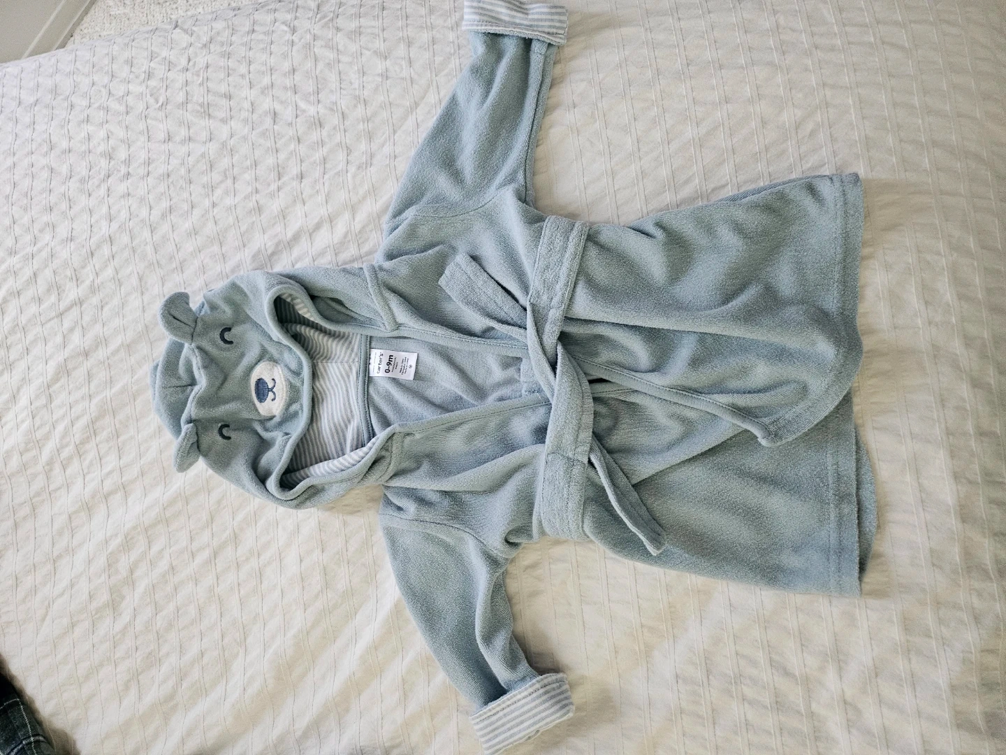 21Selling a bundle of baby clothes from Carter's! Includes a navy blue hooded jacket (6m) a robe (9m) a matching hooded sweater with pants and a cute plaid sherpa-lined romper (3m). Perfect for keeping your little one warm and cozy.