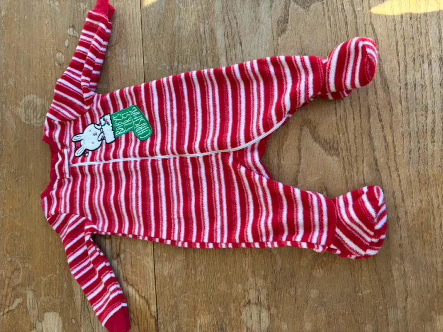 65Carter's red and white striped baby sleeper with a cute 'Baby's First Christmas' design. Size 0-3 months). Perfect for the holidays! (Lot 5)