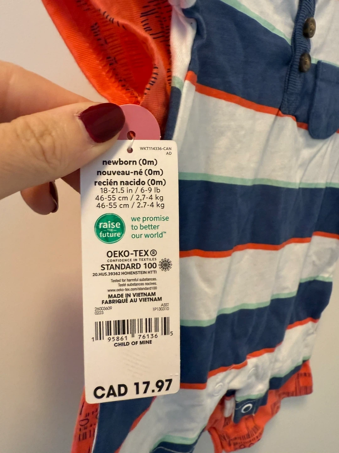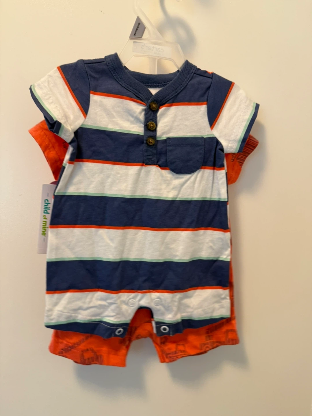 10I'm selling a brand new Carter's Child of Mine romper set, perfect for a newborn! The set includes a striped romper and an orange romper with a construction vehicle print. The tag shows it was originally $17.97 CAD. So cute!