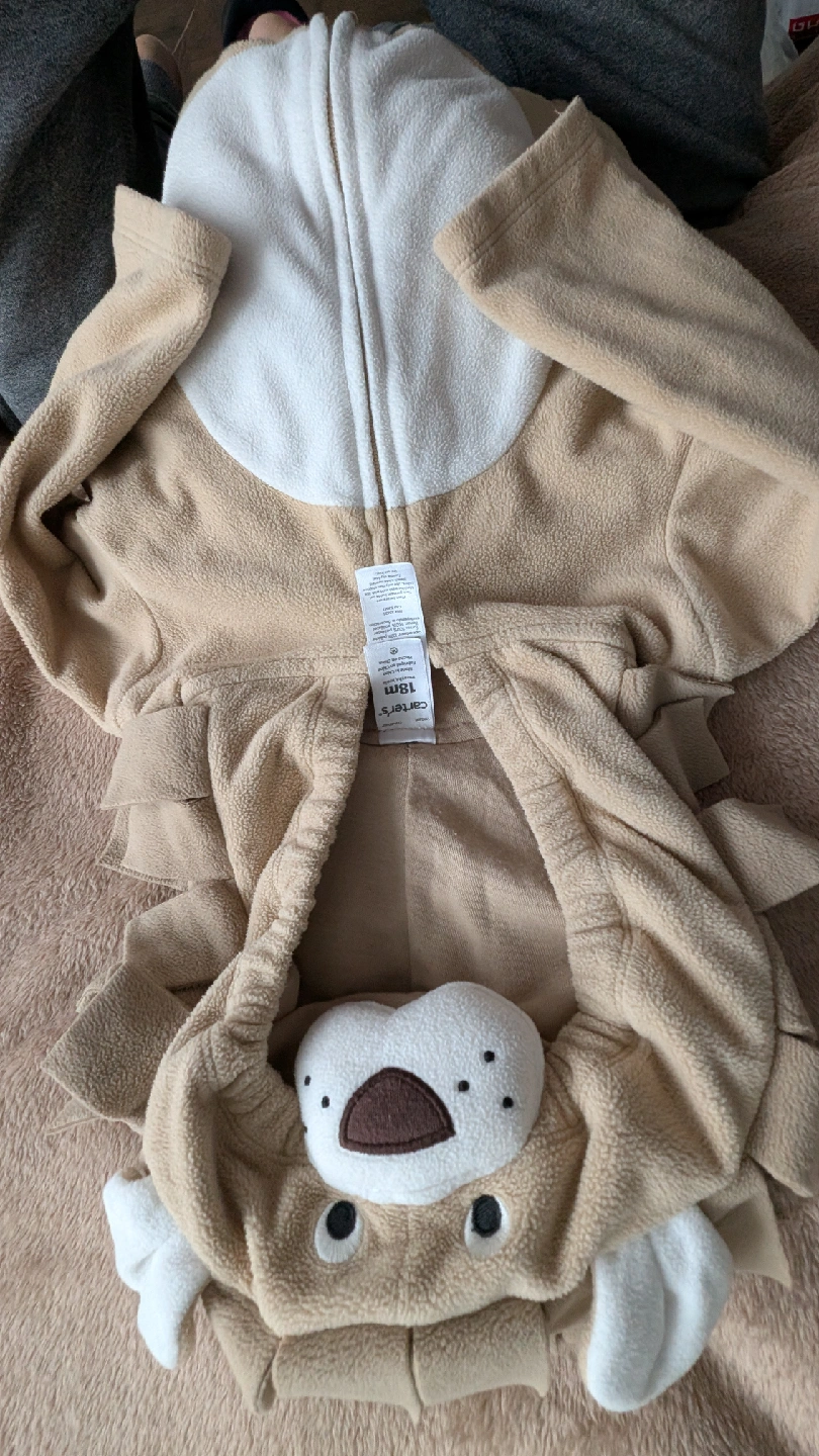 81Super cute Carter's lion costume, perfect for your little one! This adorable outfit is size 18 months and features a soft, plush material in a lovely beige colour. It's in great condition and ready for a new home!