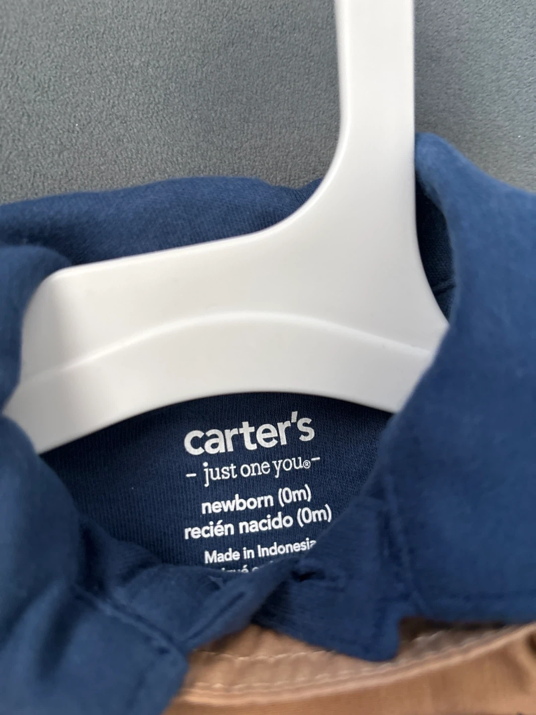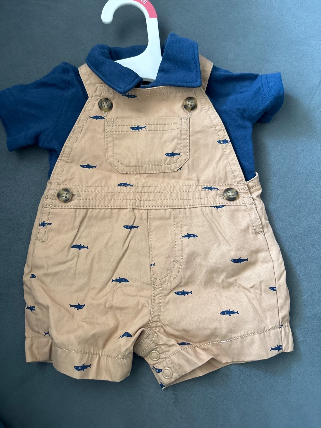 Super cute Carter's newborn (0M) outfit! The set includes a blue shirt and tan overalls with a shark pattern. Perfect for your little one!