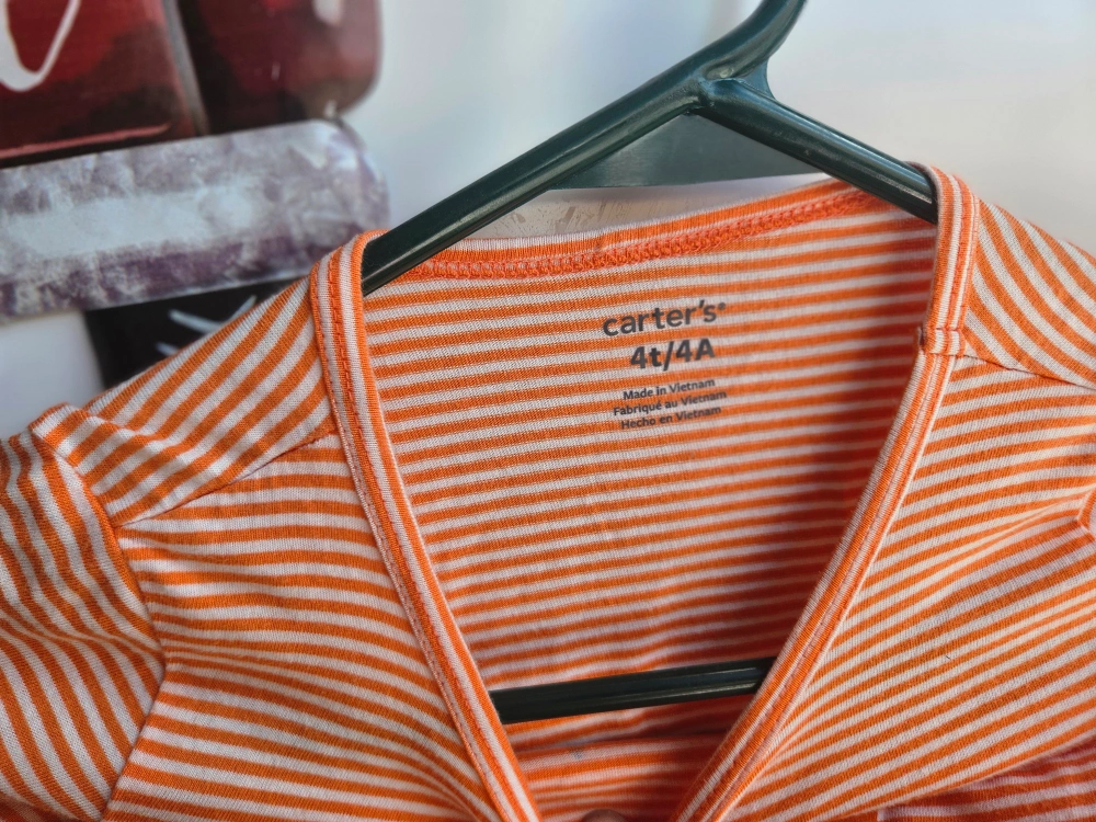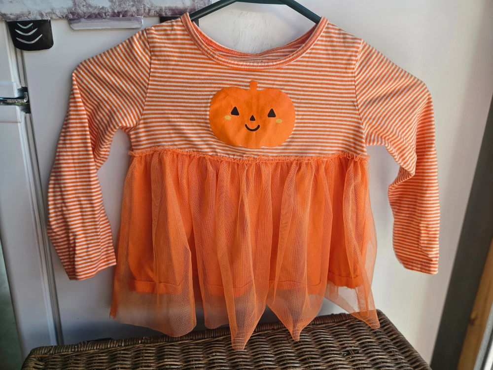 Super cute Carter's top for your little one! It's size 4T and features an adorable orange and white striped pattern with a pumpkin design. Perfect for fall or Halloween! Sfpf Oshawa Harmony Road South at 401