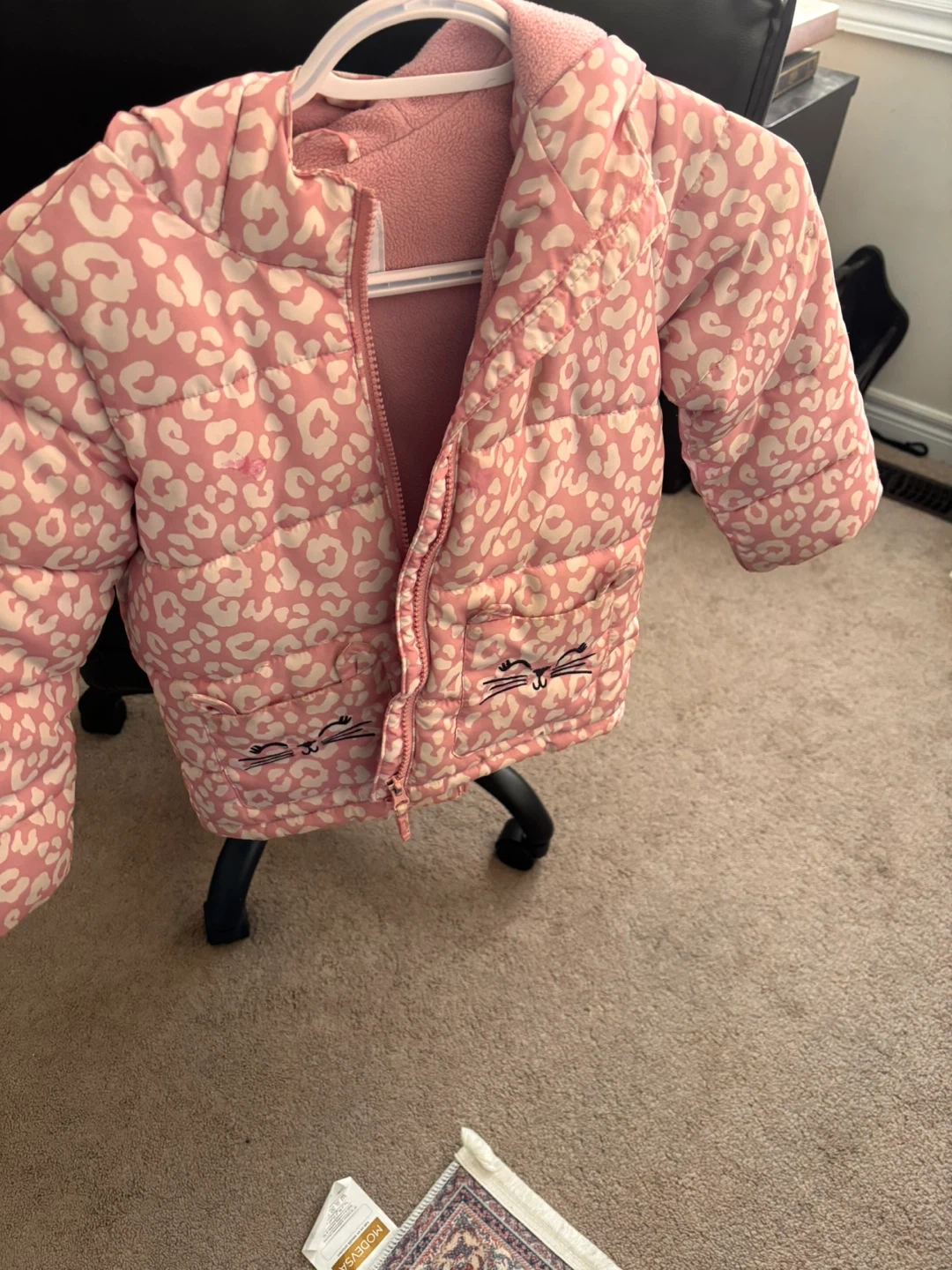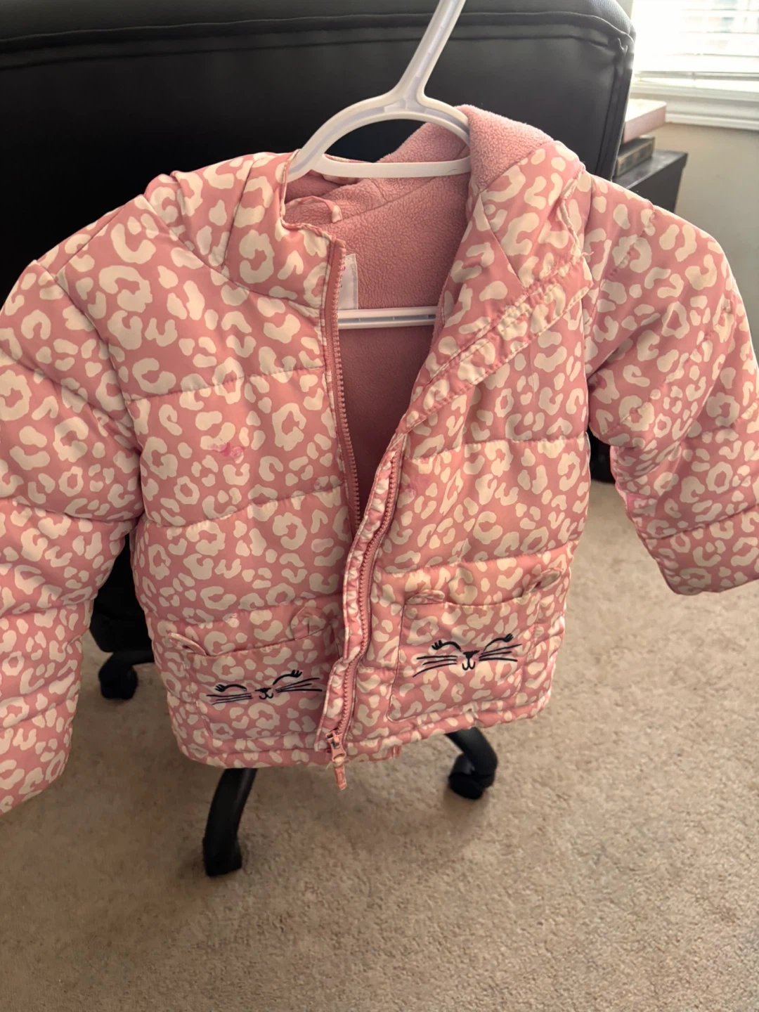 44cute pink puffer jacket from Carter's! It has a fun leopard print and little cat faces on the pockets. Perfect for keeping your little one warm and stylish Pickup mayfield and Kennedy intersection caledon