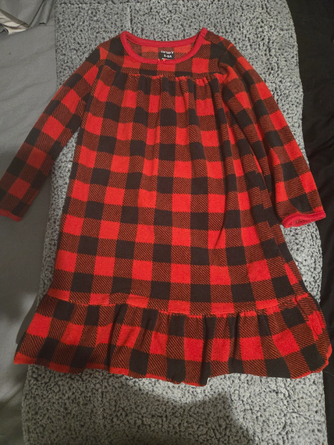 18Adorable Carter's dress in a classic red and black plaid pattern! It's a size 2-3A, perfect for a little one. The dress features long sleeves and a cute ruffle at the bottom. Great for fall or winter!