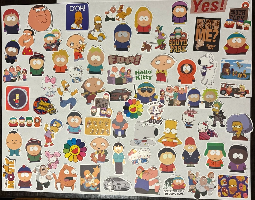 75 STICKERS IN TOTAL!! A fun collection of cartoon character stickers! Featuring characters from The Simpsons, South Park, Family Guy, and Hello Kitty. Great for decorating laptops, water bottles, or notebooks! $25 but definitely willing to negotiate