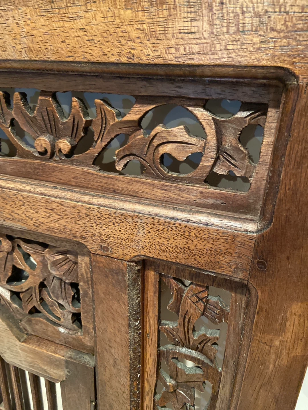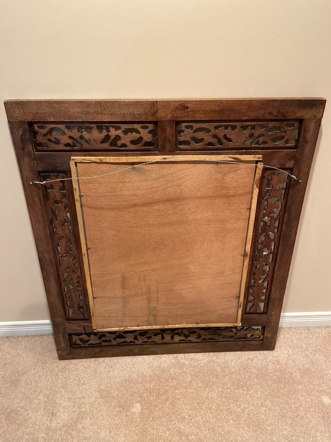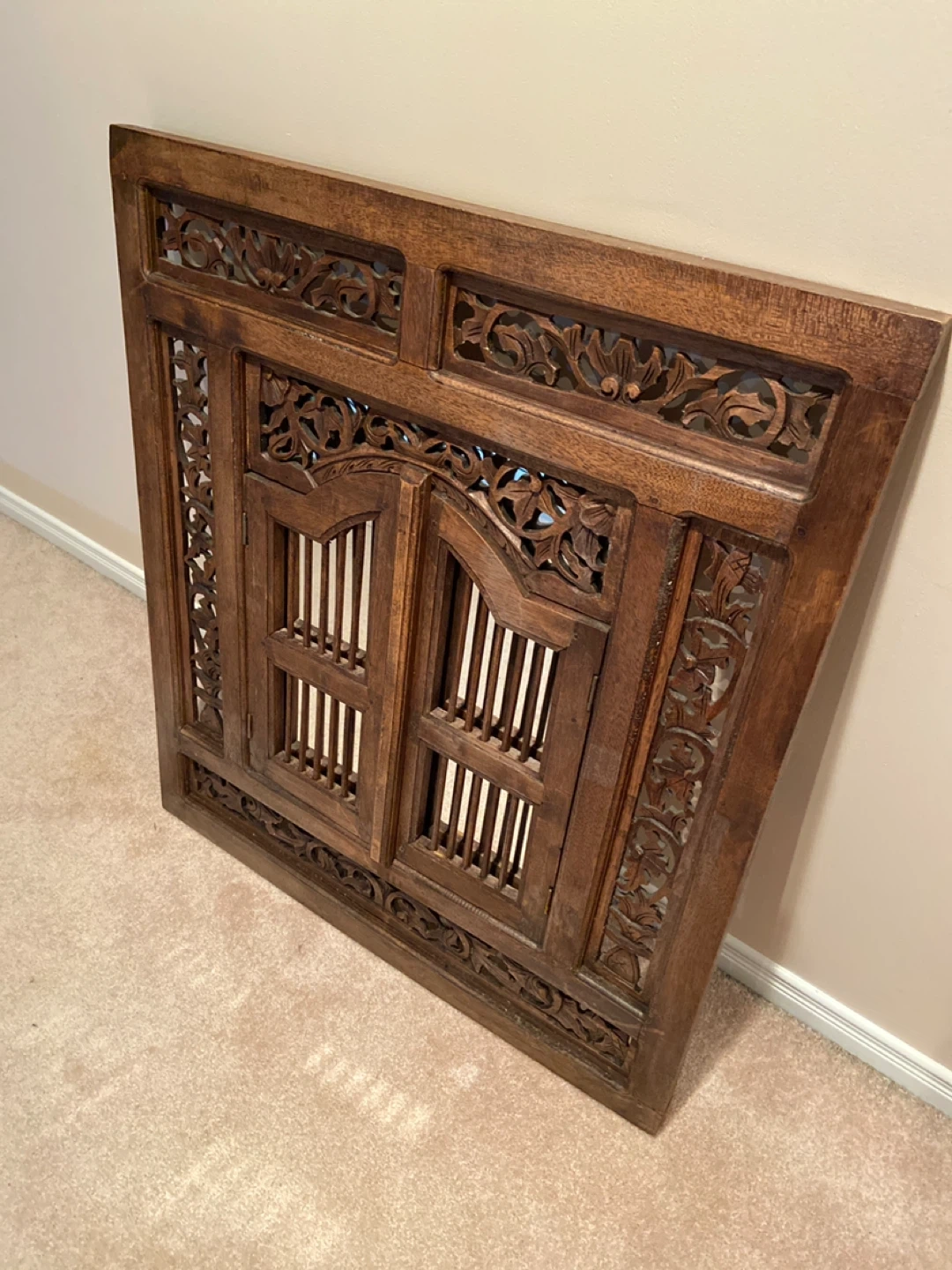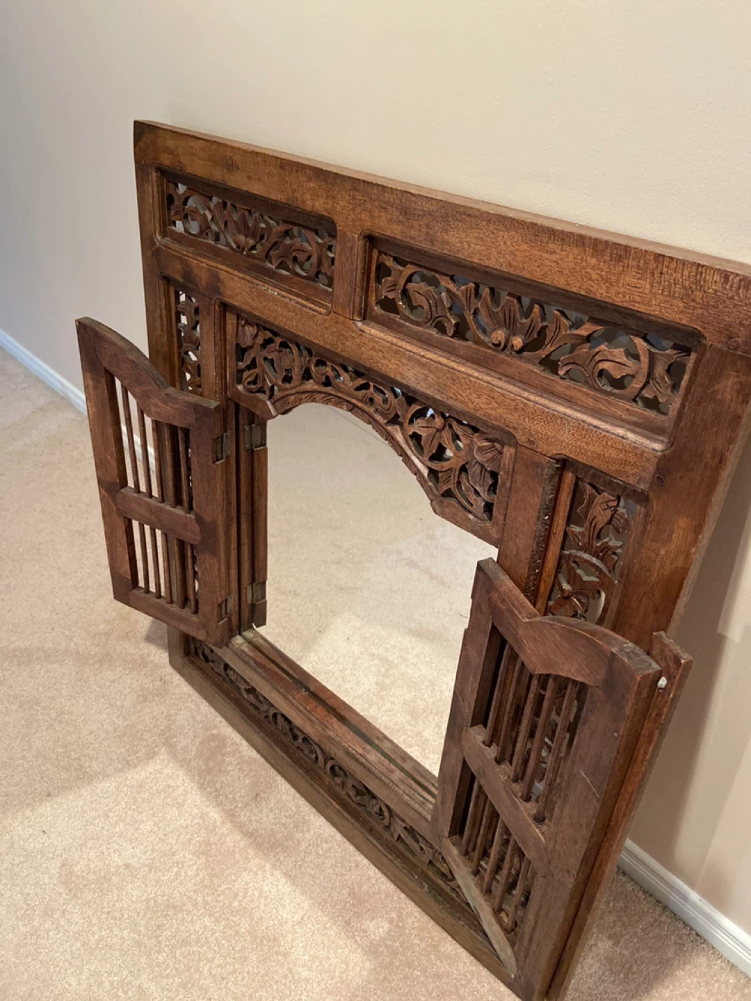 Beautiful carved solid wood mirror with shutters. It's in great condition. Heavier than it looks.