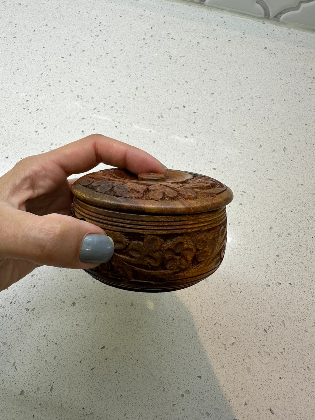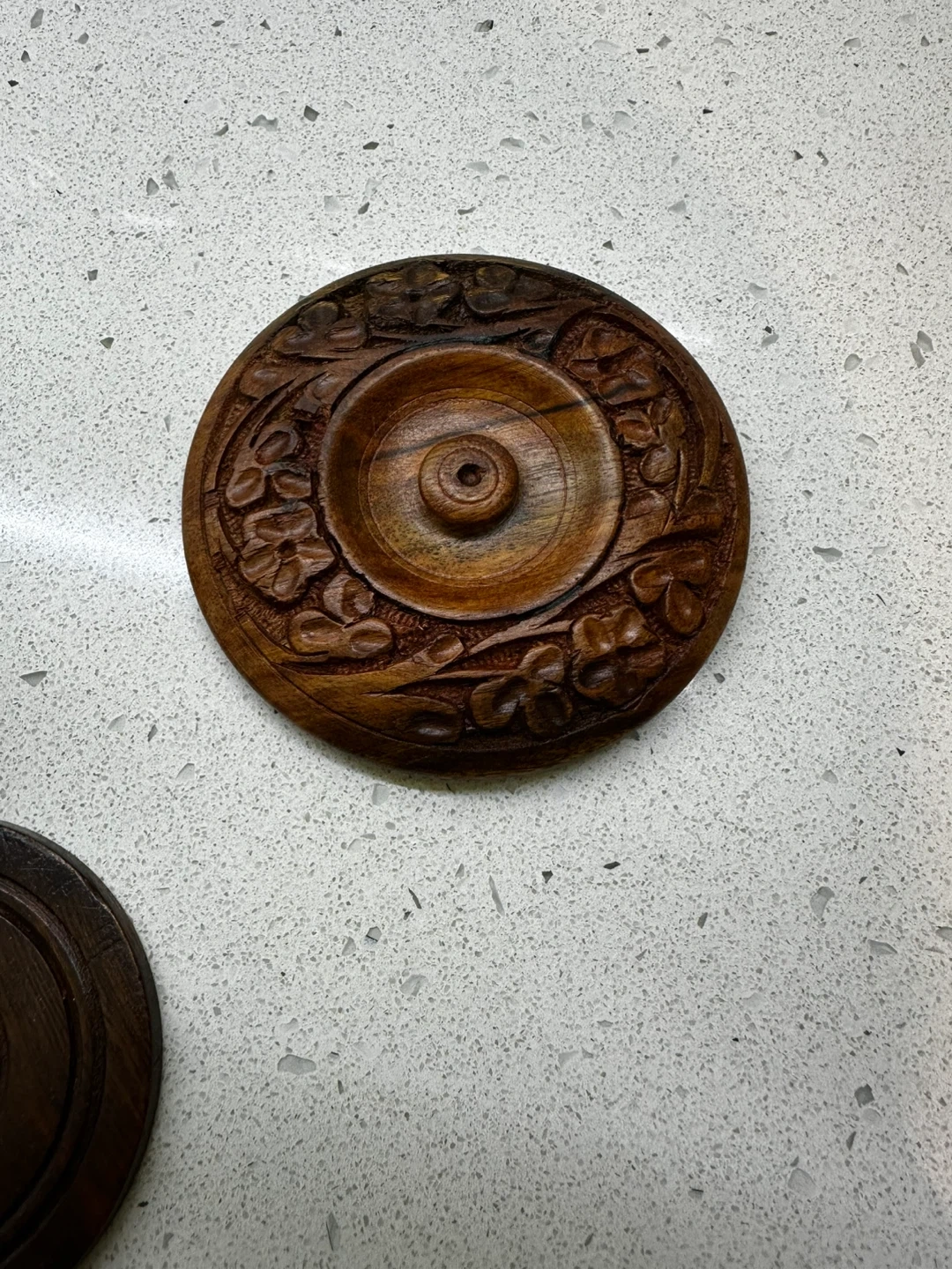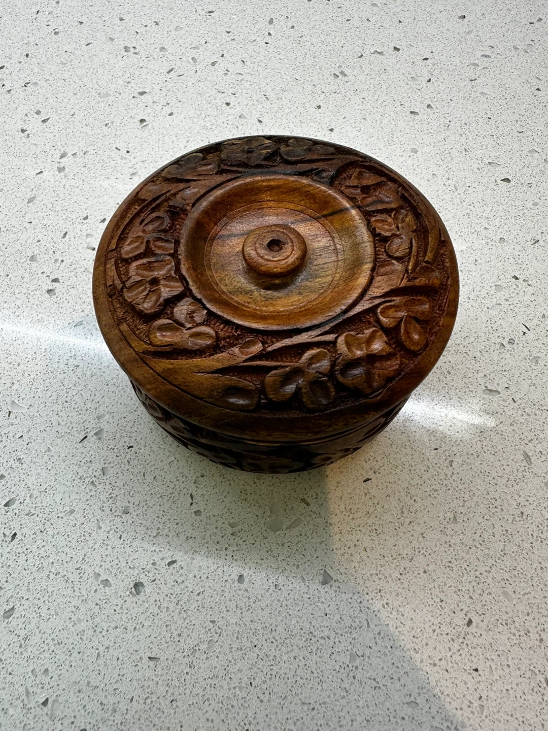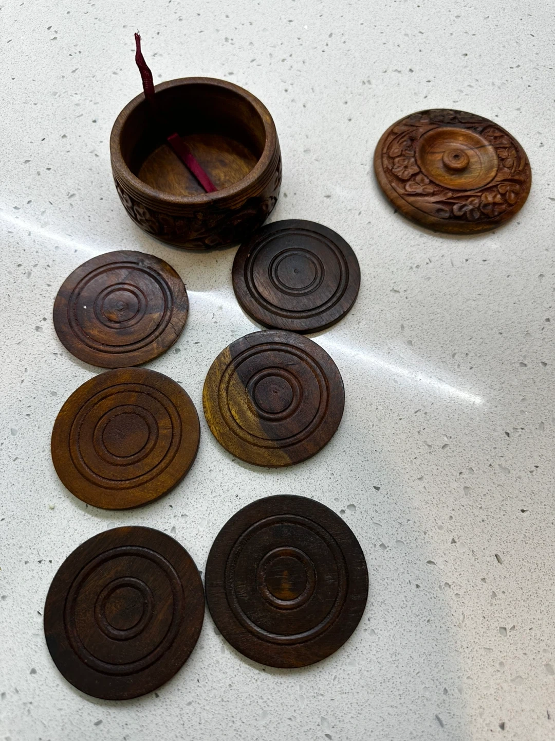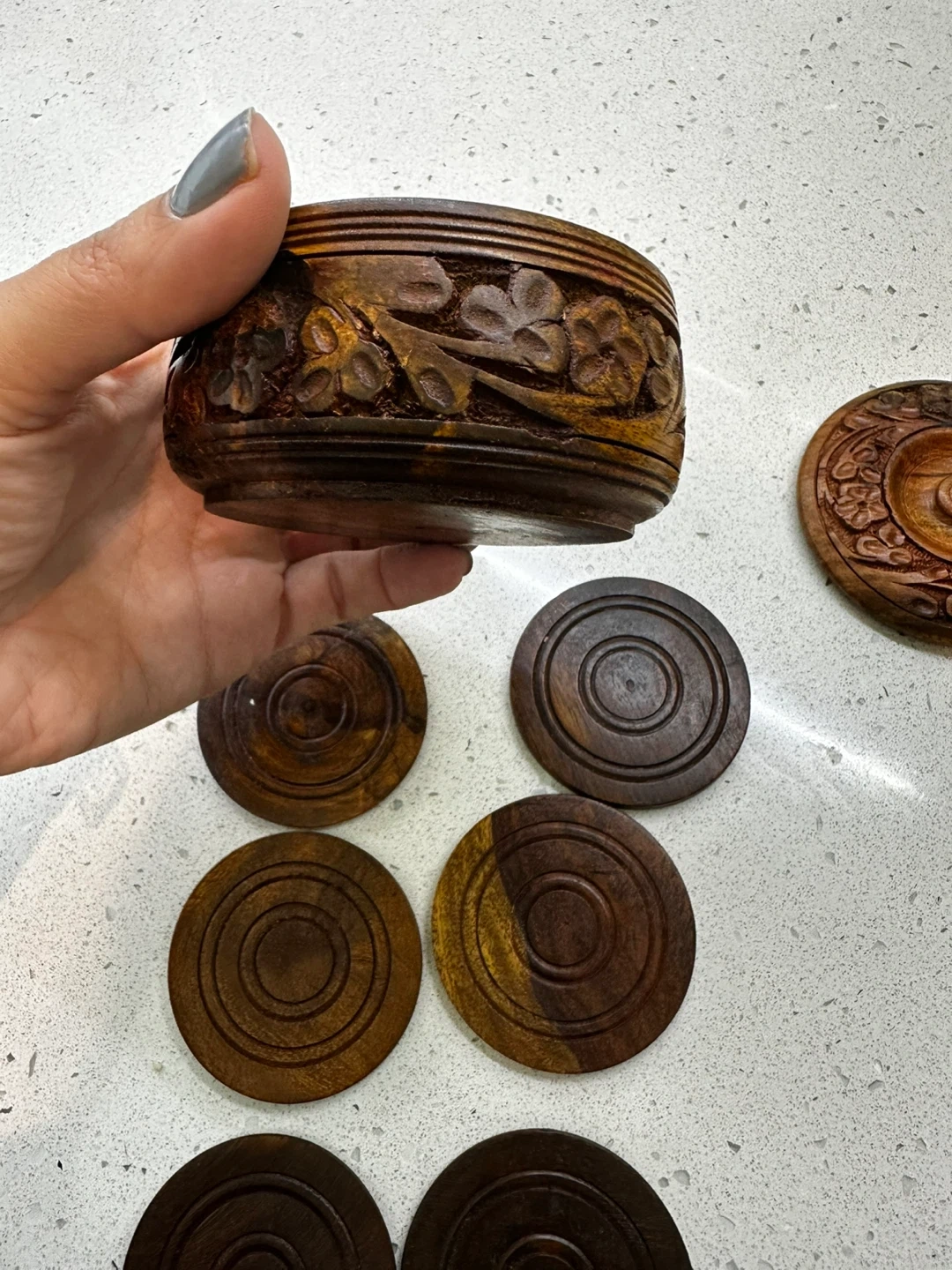 Here's a lovely carved wooden box that comes with a set of coasters. The box features a beautiful floral design. It's in great condition and would be perfect for storing small items or as a decorative piece!
