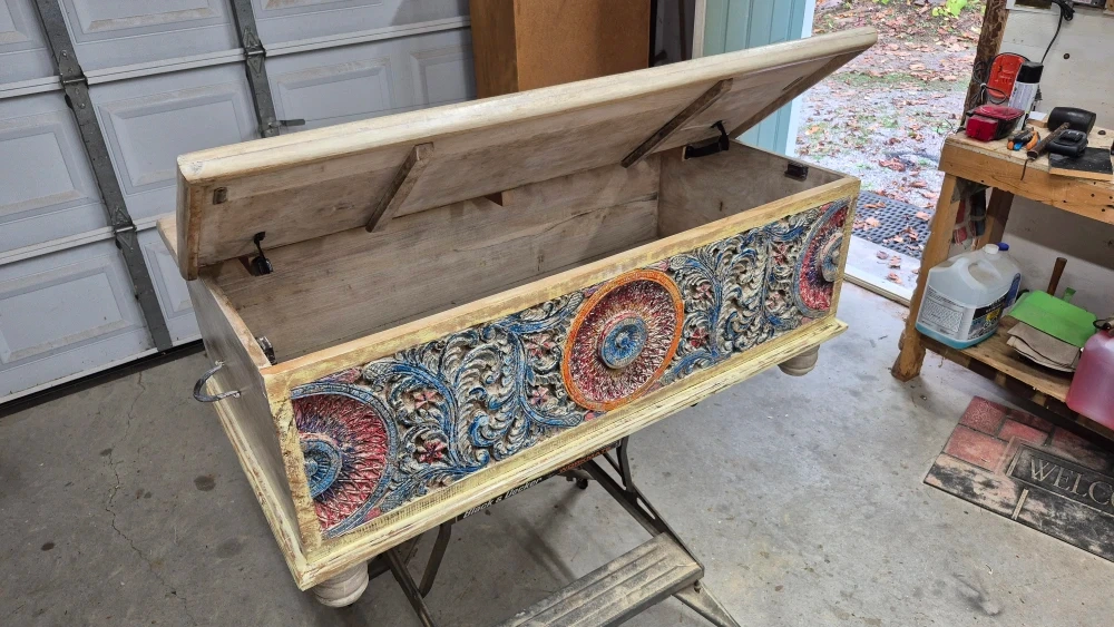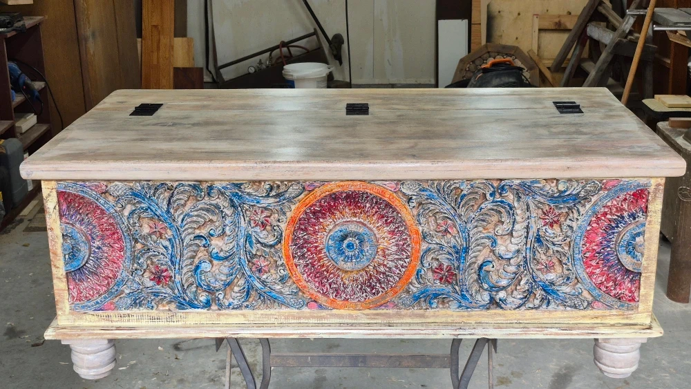 10Check out this beautiful carved wooden storage trunk! It's got a unique design with colourful floral and circular patterns. Perfect for adding a touch of character to any room while providing ample storage space
