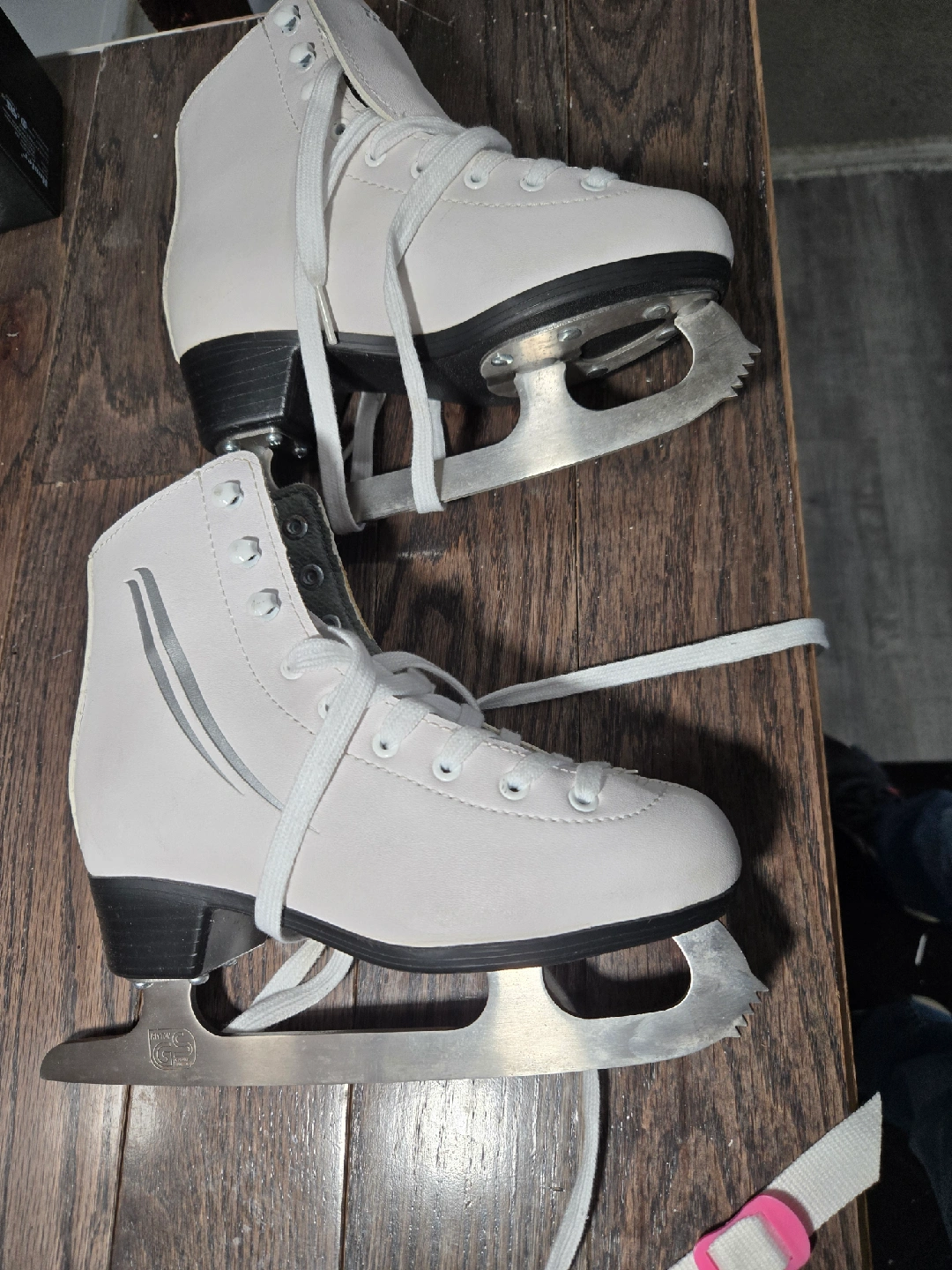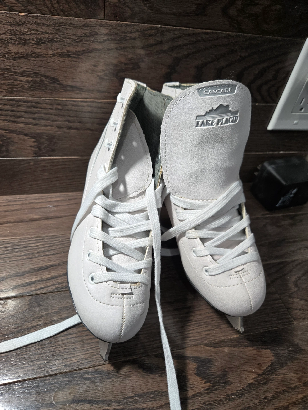 Selling a pair of Cascade Lake Placid girls ice skates in size 3. They are white with silver accents, perfect for hitting the ice rink!