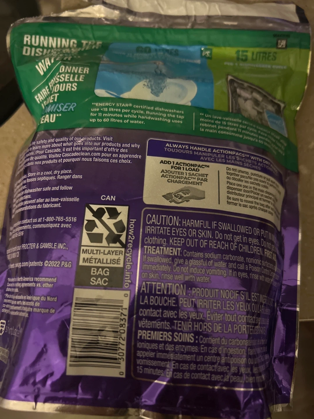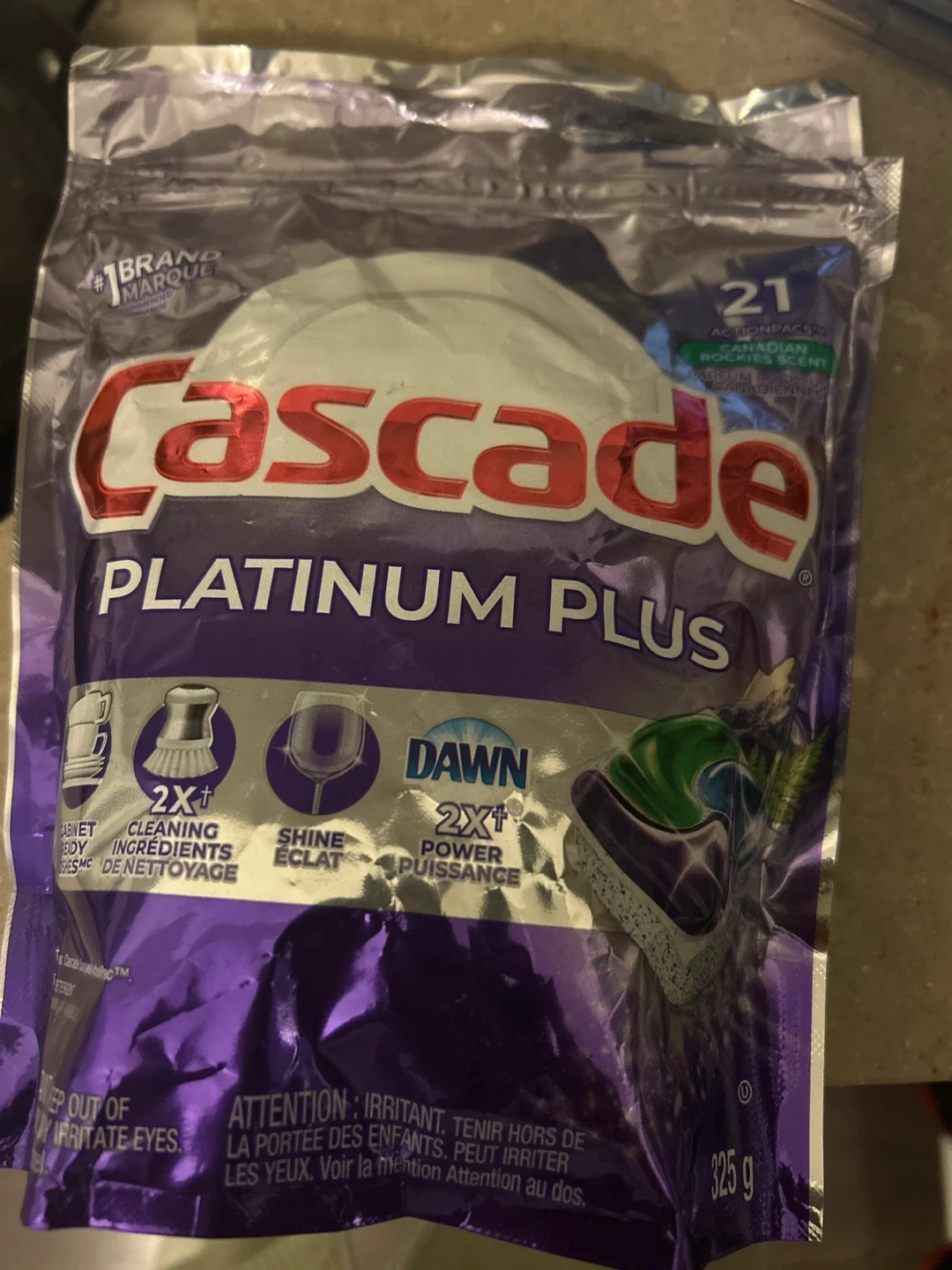154Selling a bag of Cascade Platinum Plus Actionpacs! This bag contains 21 dishwasher detergent pods. They have 2x cleaning ingredients and shine éclat, along with Dawn 2x power. Perfect for getting your dishes sparkling clean