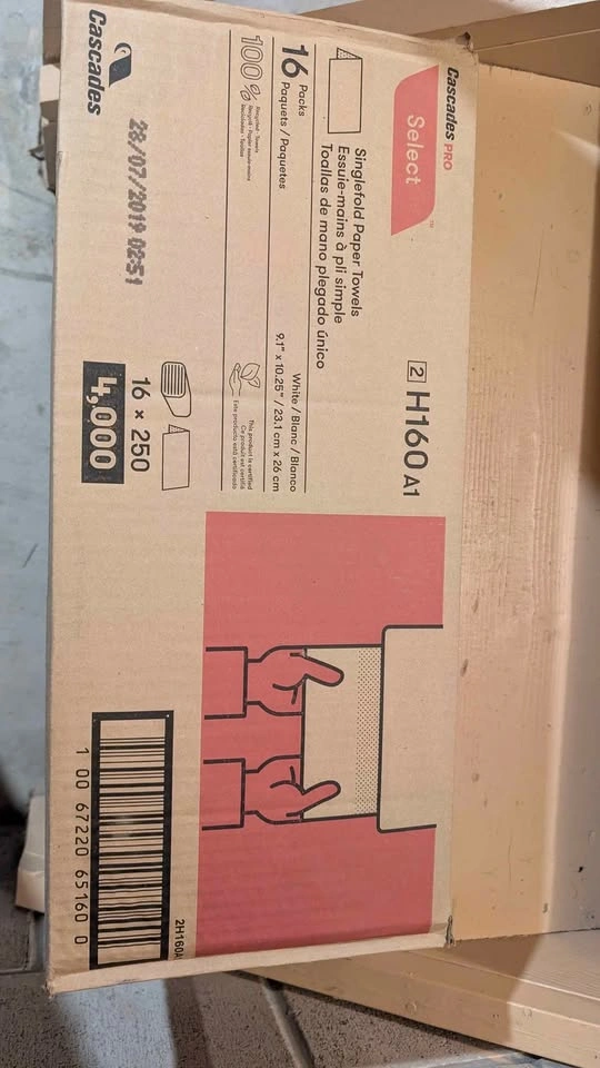 Selling 2 full, unopened boxes of Cascades PRO Select Singlefold Paper Towels. 1 Box (4000 towels) = 25 dollars 2 Boxes (8000 towels) = 40 dollars Similar products on Amazon = 60 dollars + taxes (each box) Old inventory but unopened Boxes Perfect for home, office, workshop, garages, restaurants, cleaning businesses, or stocking up! ✅ Brand New / Sealed box ✅ 4,000 towels total ✅ 16 packs of 250 towels each ✅ White, single-fold, commercial quality ✅ Fits most universal singlefold paper towel dispensers Product Details: Model: H160A1 Size per sheet: 9.7" x 10.25" (24.3 cm x 26 cm) 100% recycled fiber Eco-friendly option Condition: unopened Boxes.