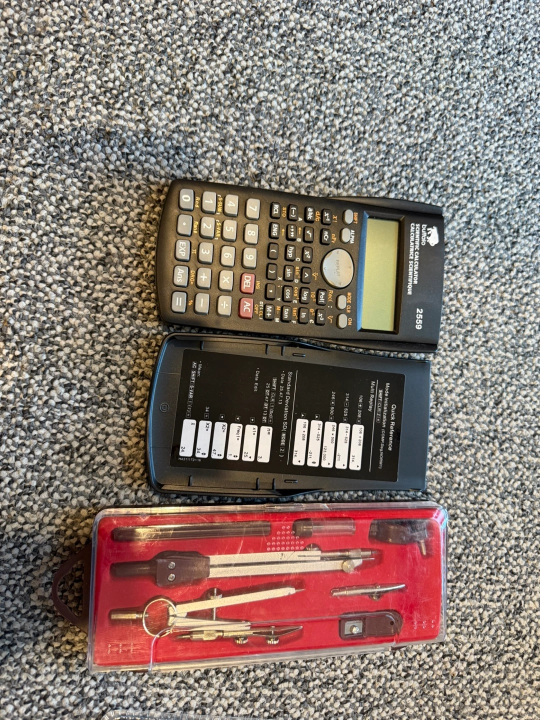 18Selling a Casio 2850 calculator along with a geometry set. Both are in good condition and ready to use. Great for students or anyone needing these tools!