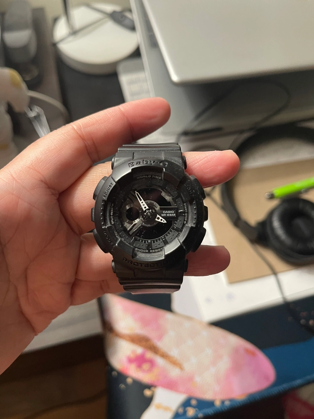 Black Baby-G watch. Shock resistant. World time function. Features a black resin band and case. Pre-owned.