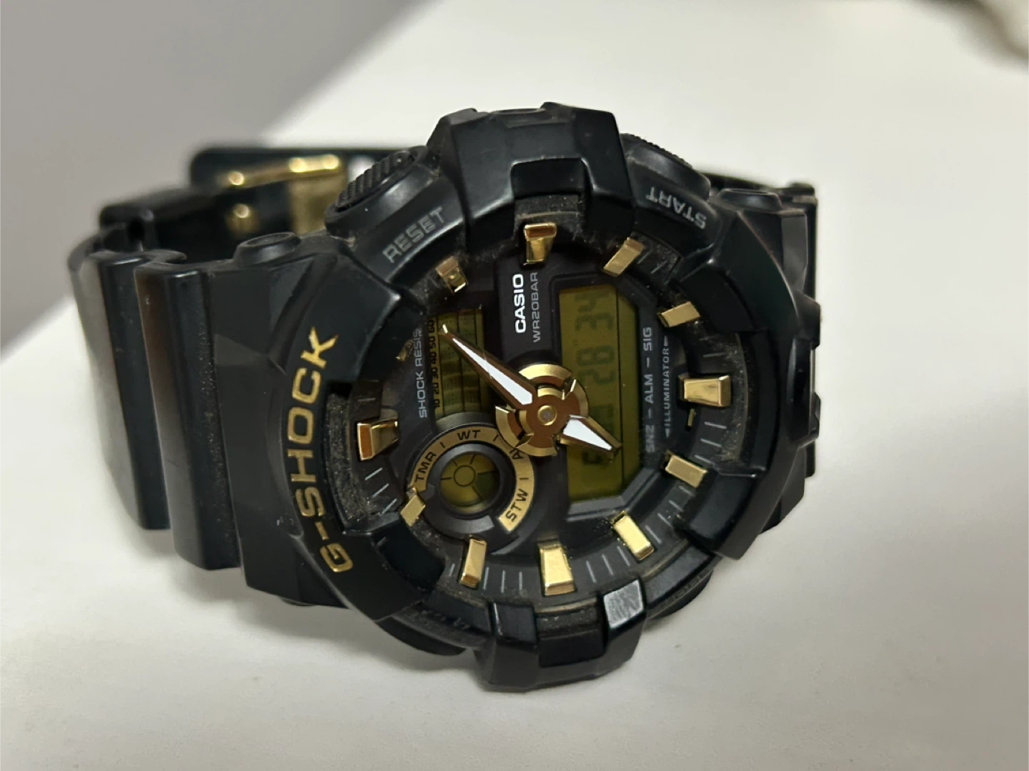 Selling a Casio G-Shock watch in black and gold. It has a shock-resistant structure and is water resistant. The band also has the G-Shock logo on the buckle!