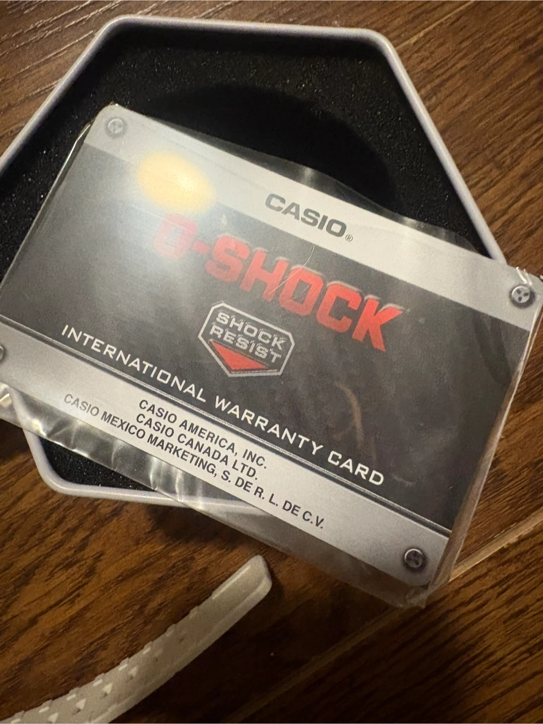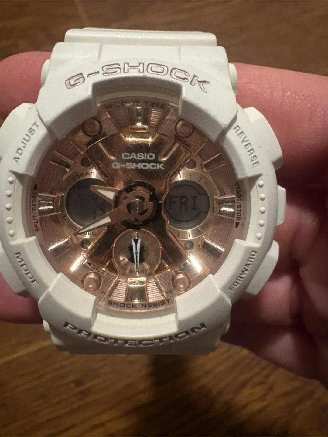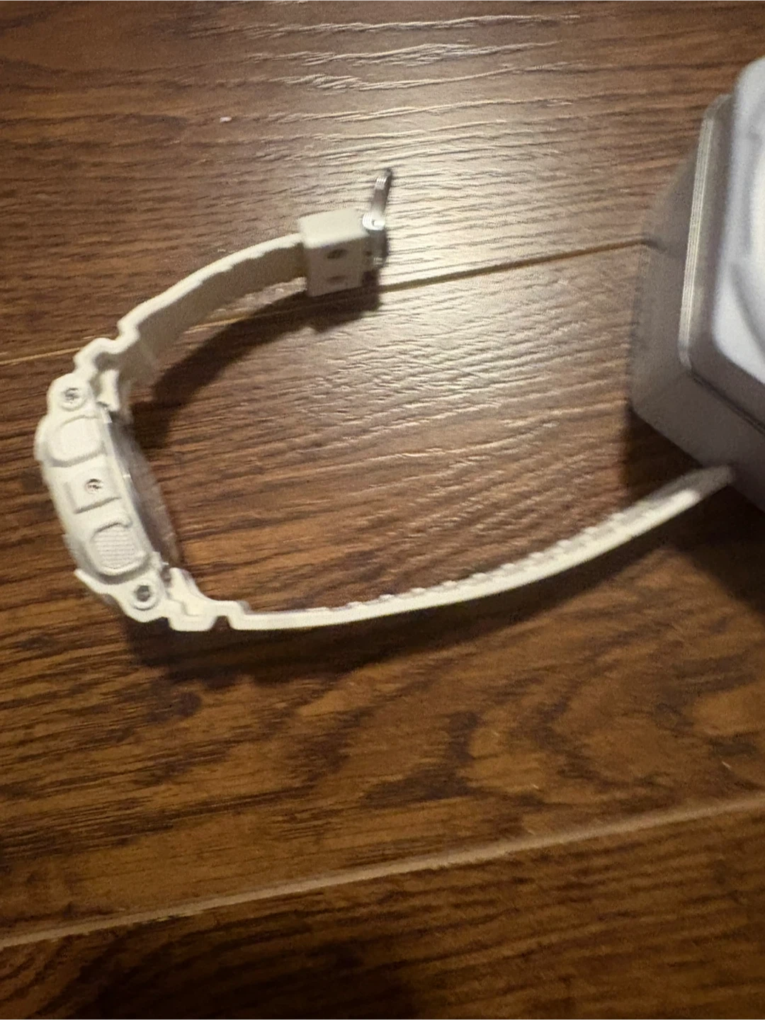 10Selling a Casio G-Shock watch! It's in perfect condition and comes with its original box and warranty card. The watch features a stylish white and rose gold design. It's a durable and fashionable timepiece, perfect for everyday wear. It is in perfect condition and barely worn as I have another watch similar.