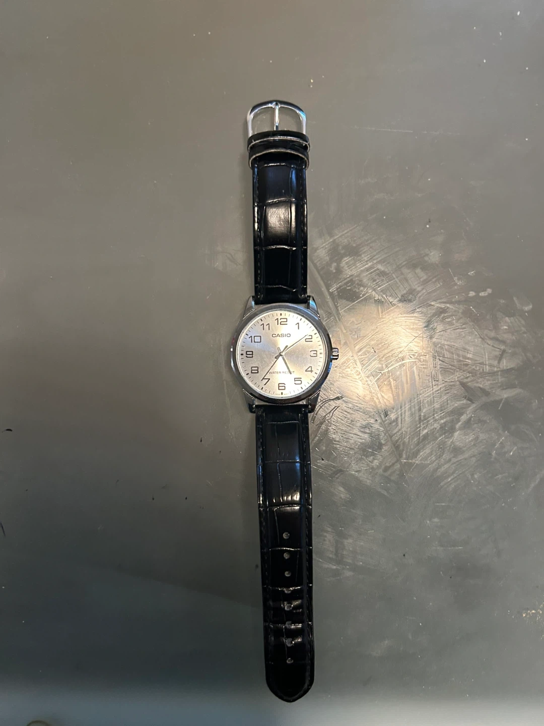 Selling a Casio men's watch with a black leather strap. It's in great condition and has a classic, timeless look. Perfect for everyday wear or dressing up for a special occasion. There are no scratches in the watch and I only have the watch for this product. If you are interested, please feel free to reach out to me.