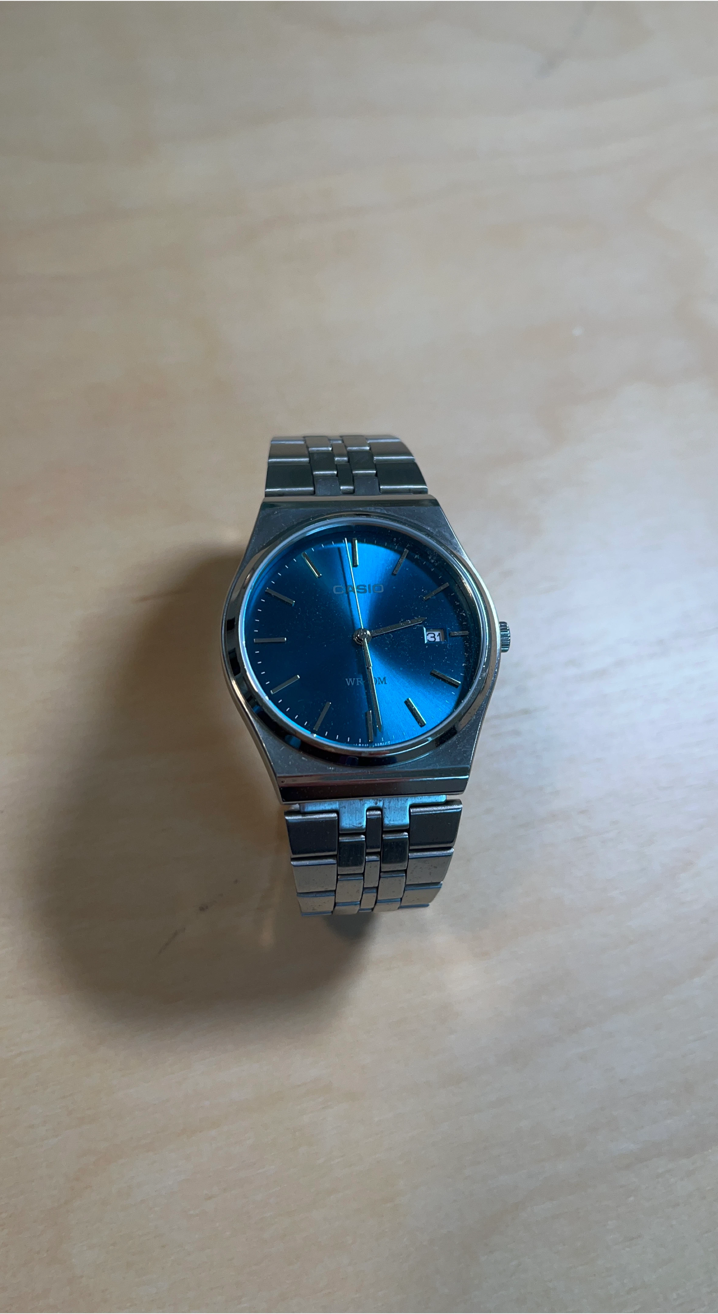 Selling a Casio watch with a beautiful blue dial and a stainless steel bracelet. It's in great condition and ready for a new wrist! The watch is a classic and stylish timepiece that can be worn every day. It's a great addition to any outfit!