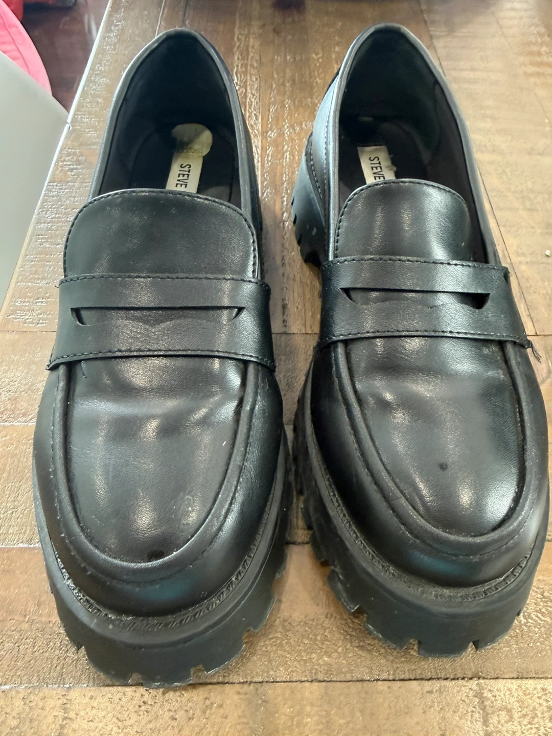 Classic black leather loafers with a chunky lug sole. These stylish shoes offer a comfortable and trendy look. Slip-on style with a strap accent across the vamp.