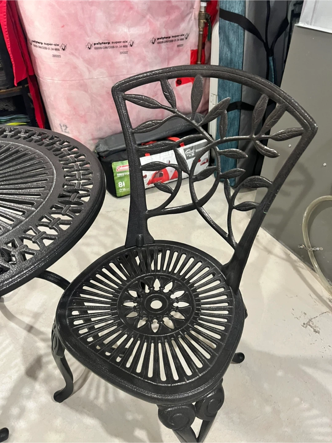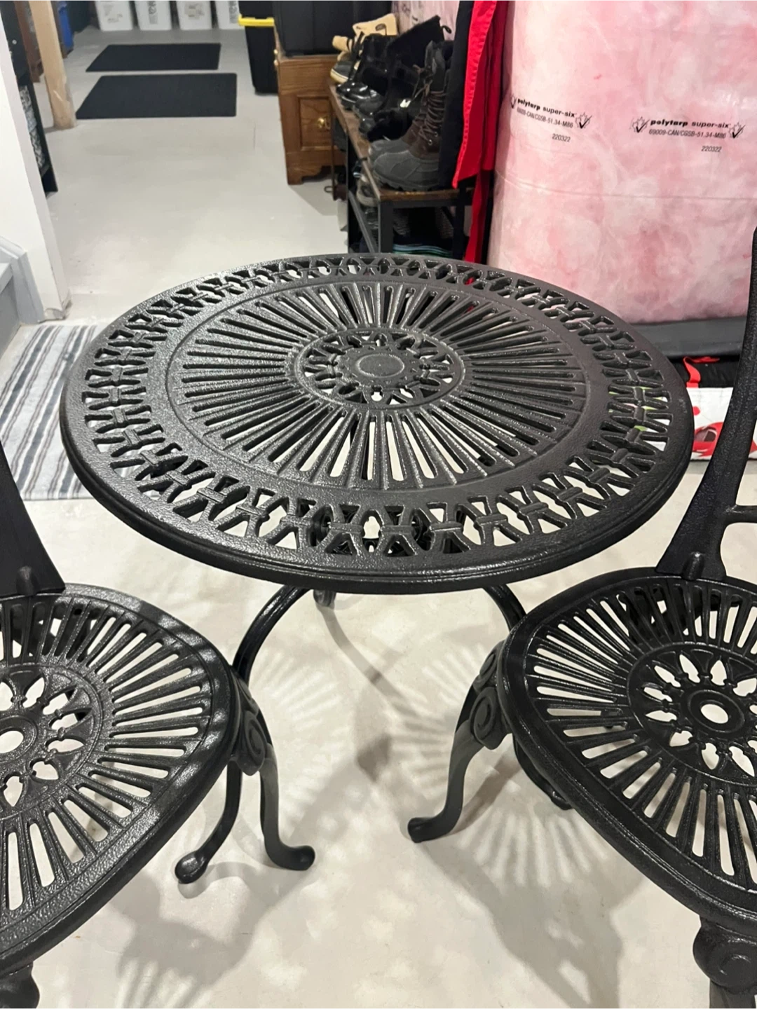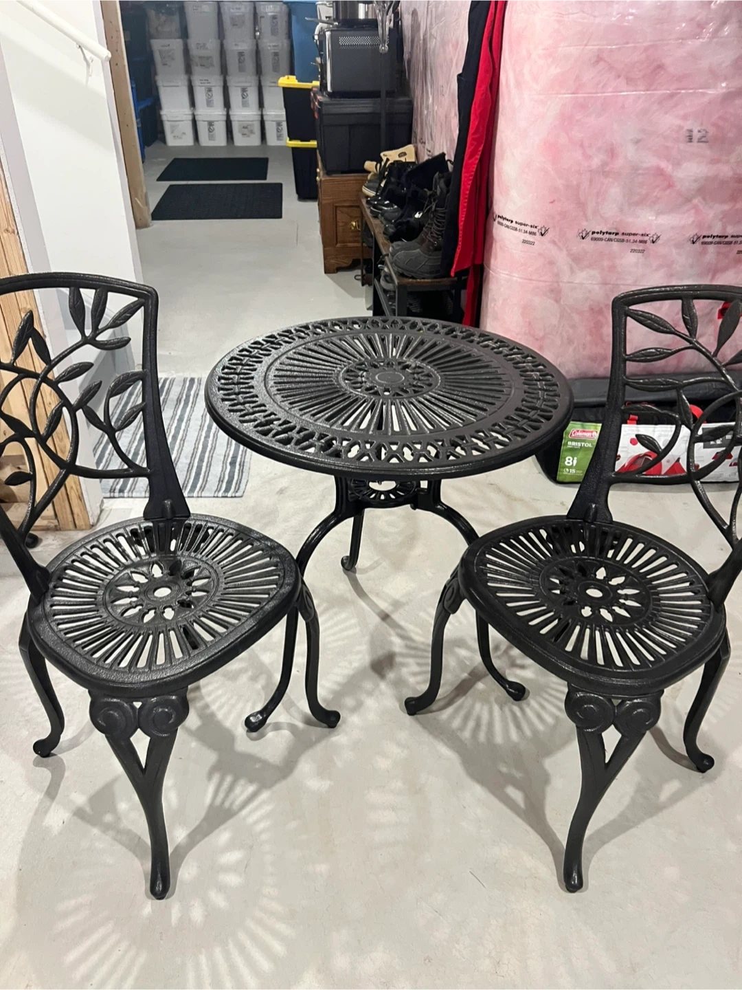 Selling a charming cast aluminum bistro set, perfect for a small patio or balcony! The set includes a round table and two chairs, all in a classic black finish. The intricate design adds a touch of elegance to any outdoor space. It's durable and weather-resistant, ready for those summer days!