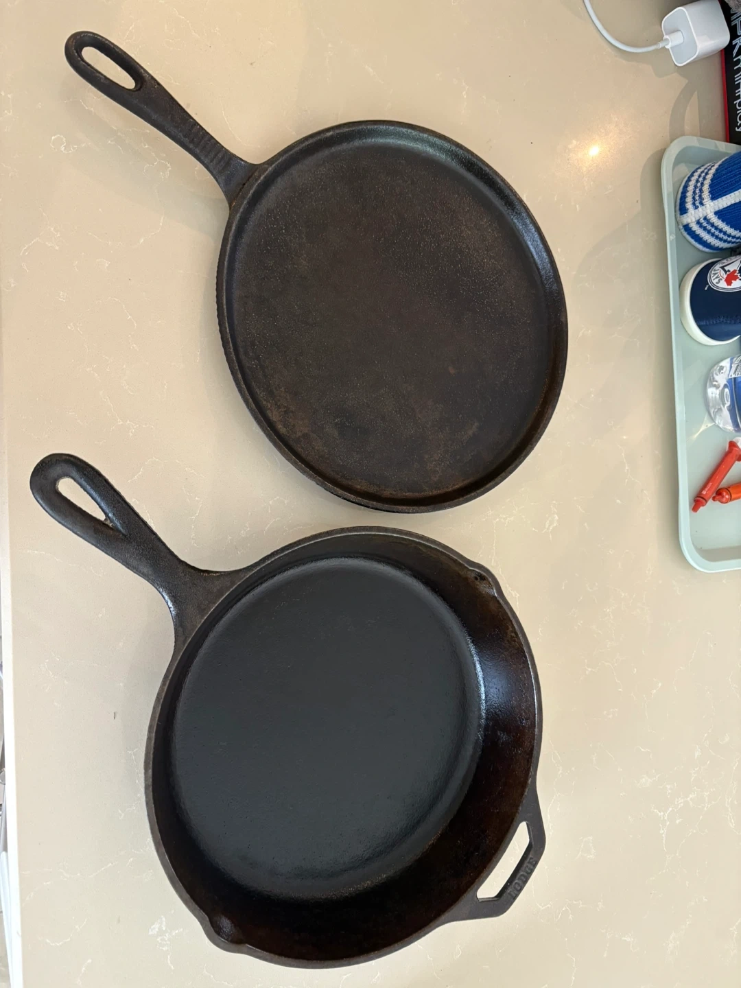 Cast Iron pan (Lodge) and skillet in excellent condition. Cleaned and seasoned with oil. Pick up near Bermondsey & O’Connor.