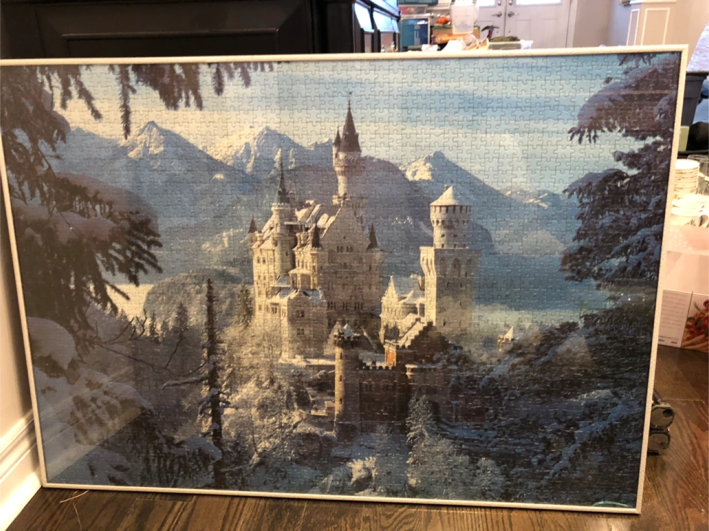Selling a castle jigsaw puzzle! It's a beautiful image of a castle in a snowy mountain landscape. Perfect for puzzle enthusiasts! It is Great as a decorative frame to hang on the wall above the fireplace.