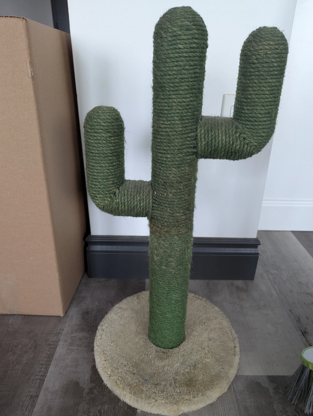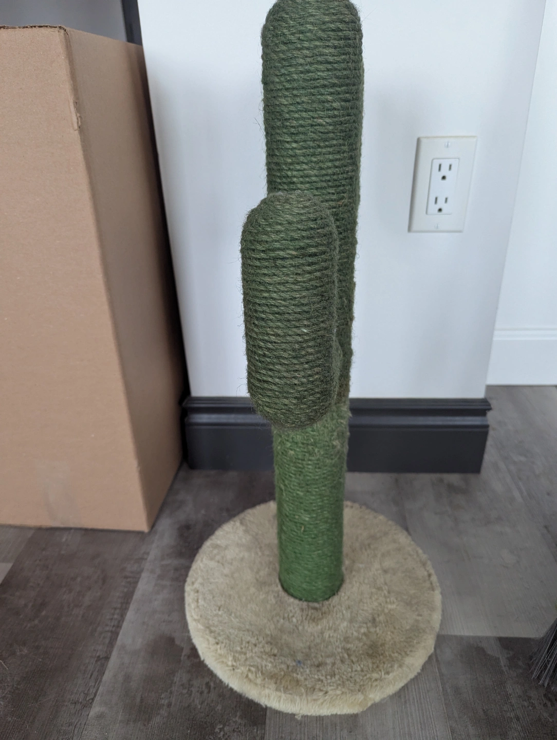 77Unique cactus-shaped scratching post. Durable sisal rope covering. Round base. Good for cats to scratch and play.