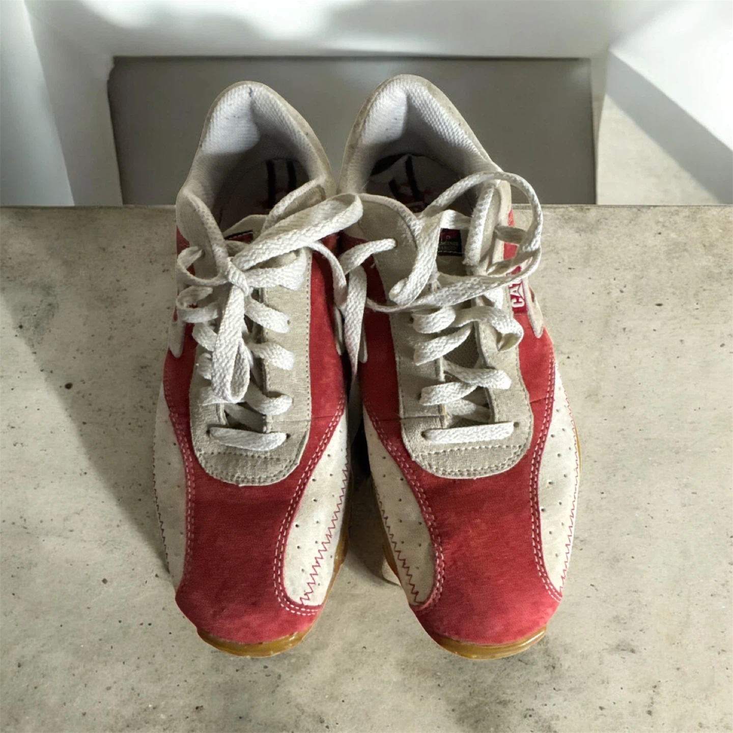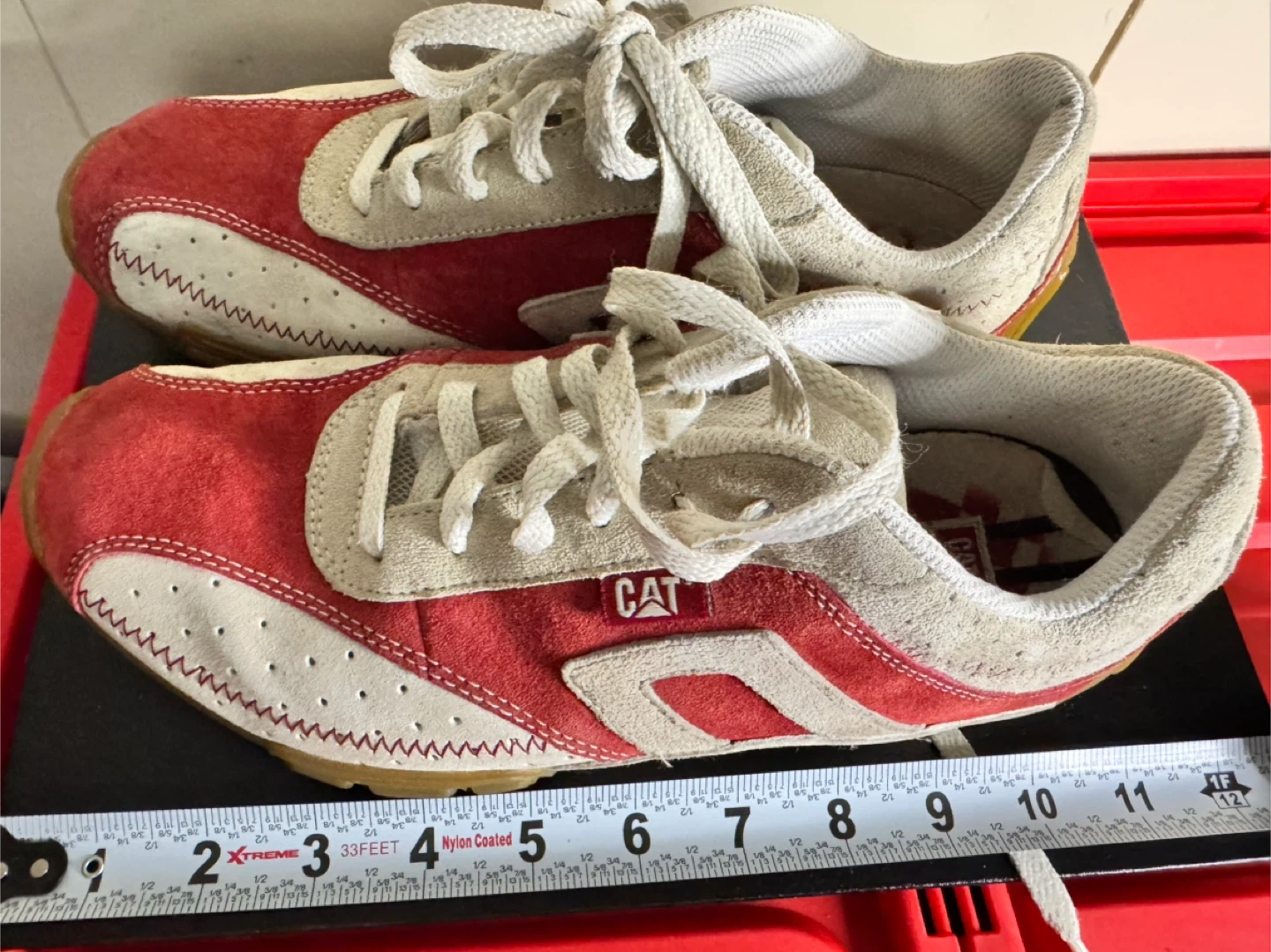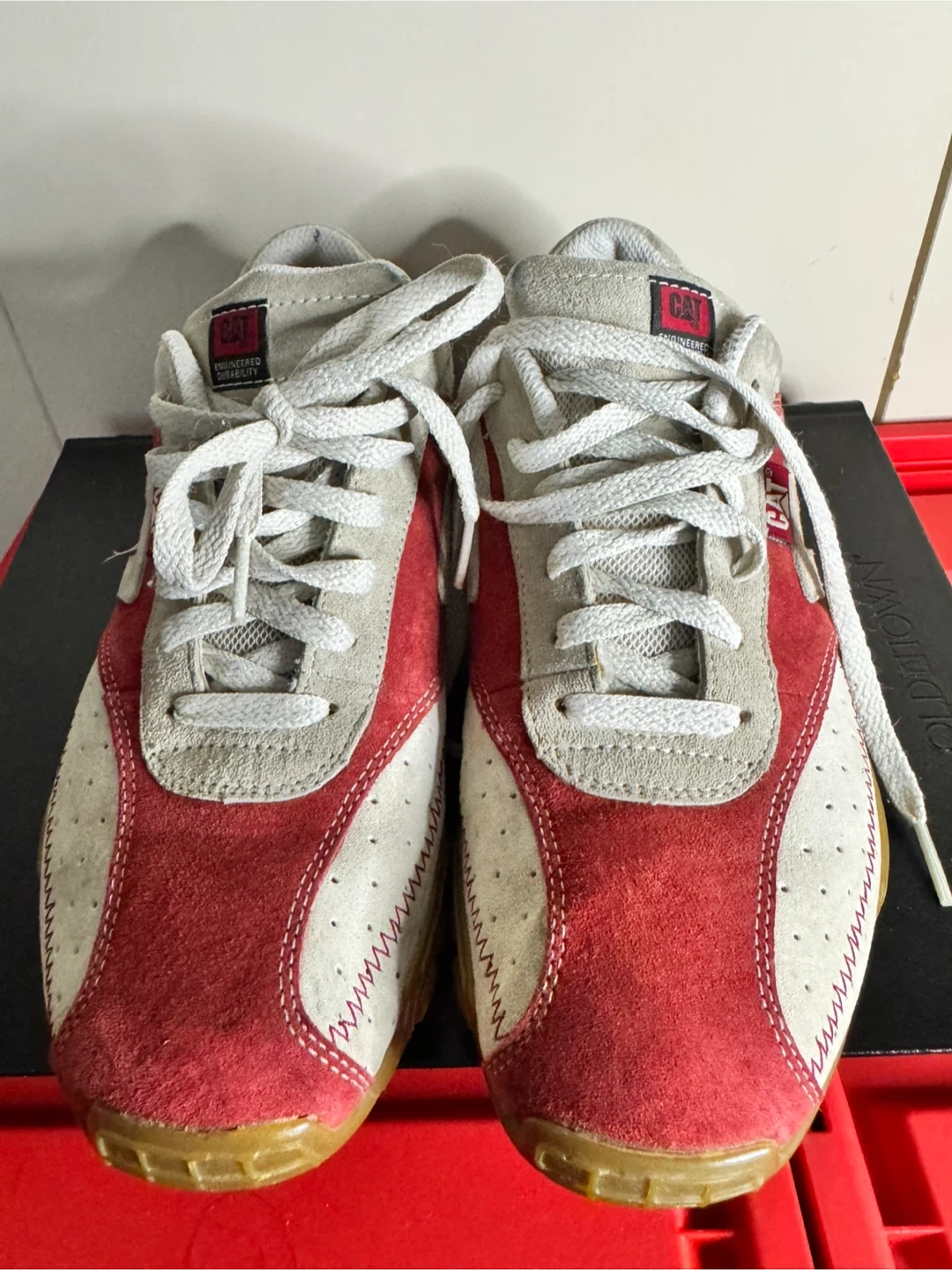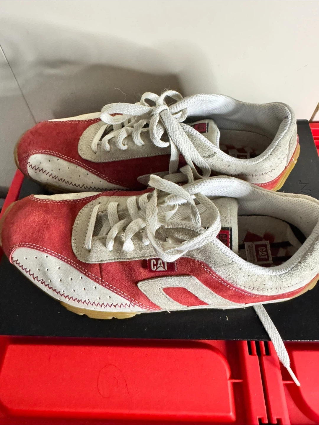 27Selling a pair of CAT (Caterpillar) sneakers in red and white. They show some signs of wear but still have lots of life left! Great for casual wear or light activities.