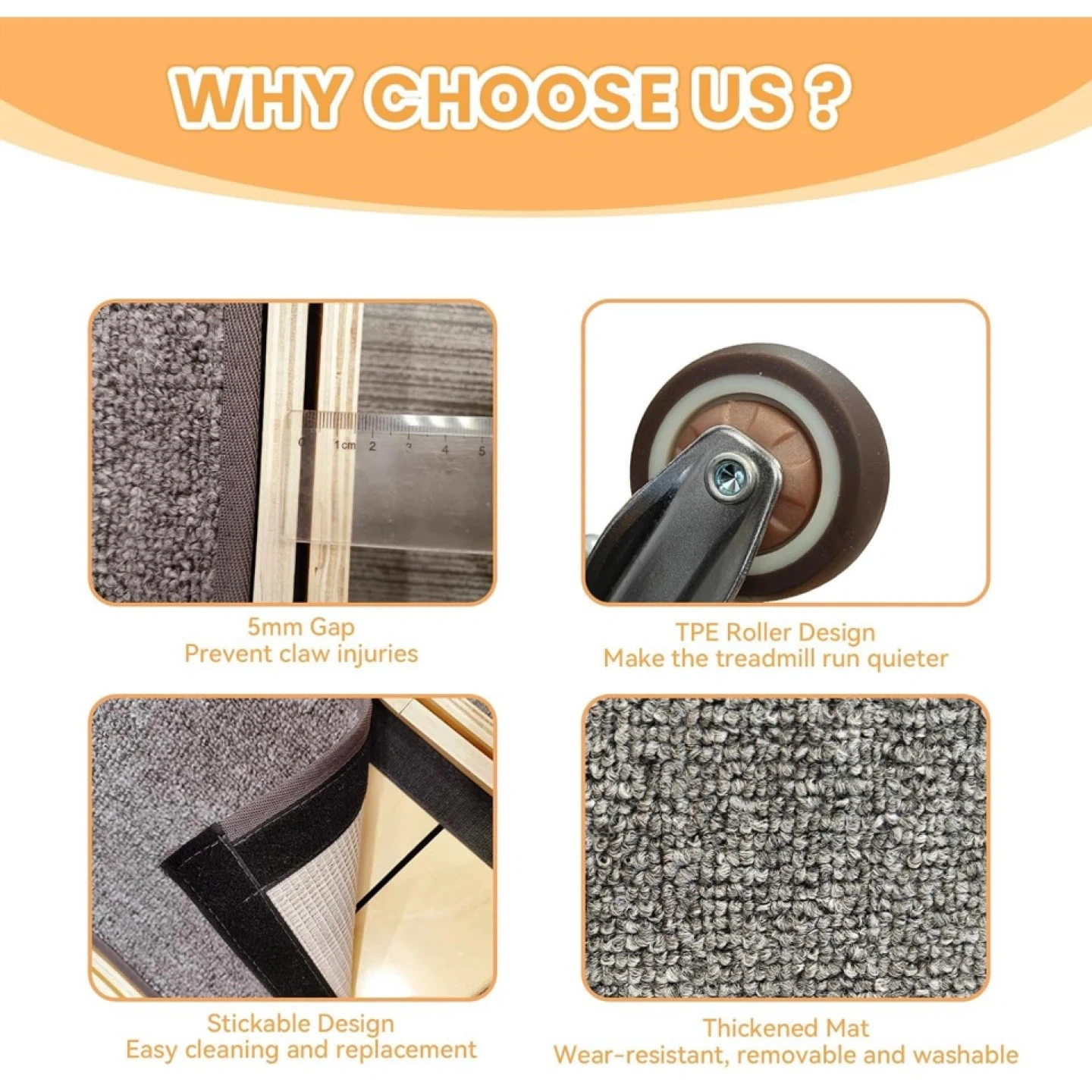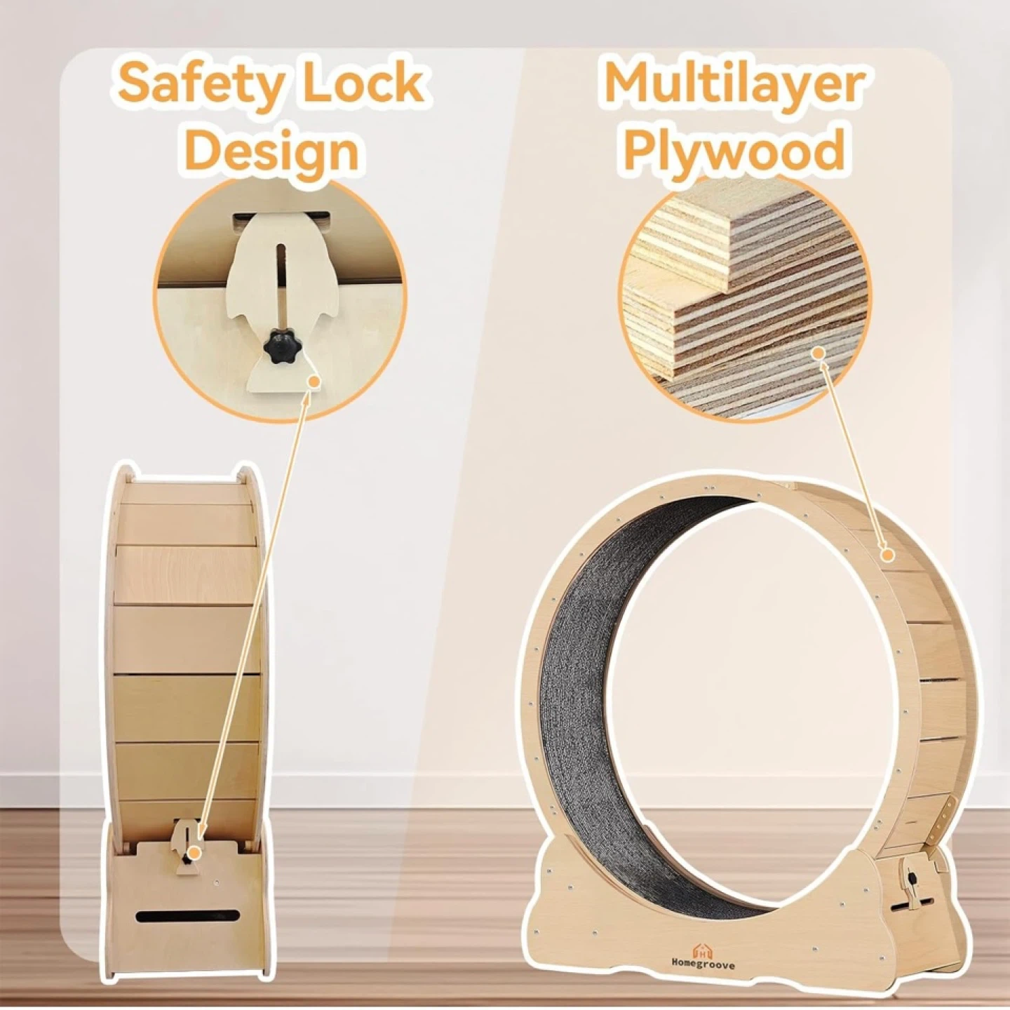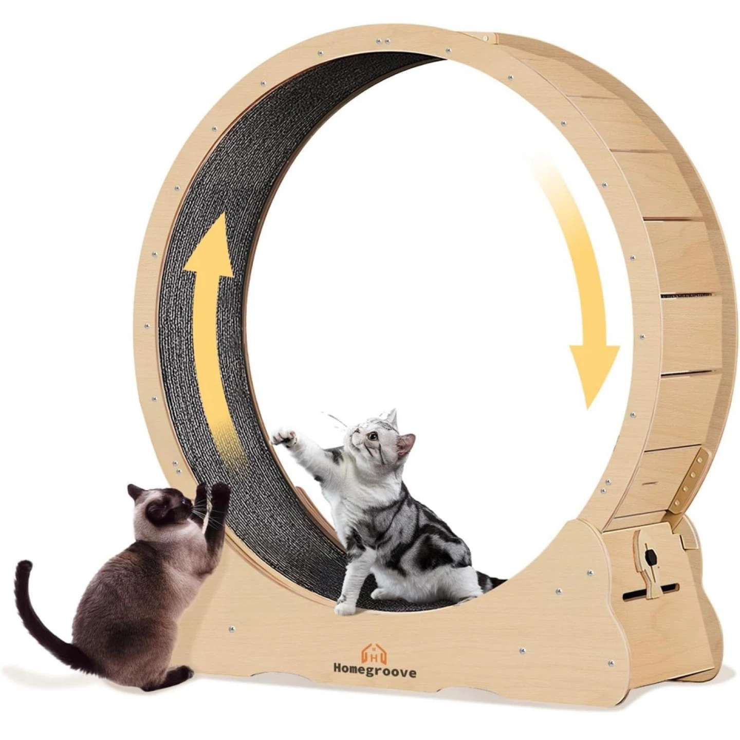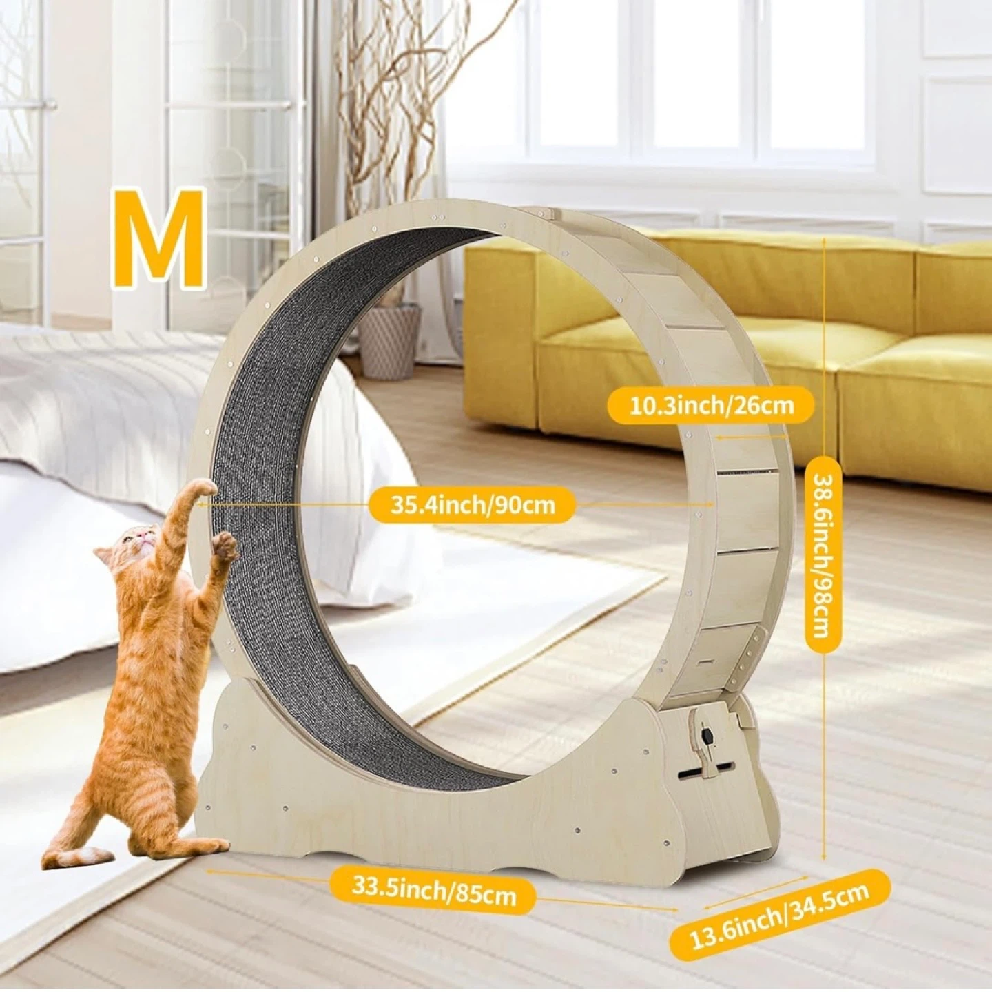 22🌷 Brand new in box!! Can open for check Price firm.. Latest Cat Running Wheel: Most pet cats are overweight because they spend long hours indoors and lack exercise. And running is the best way to exercise, help your cat stay physically active and reduce boredom. This new upgrade of our cat treadmill, silent and effective in preventing cats from pinching their feet, is great pet furniture Silent Design & Built-in Security Lock: The upgraded TPE silent roller is quiet when running. Even if the cat uses the treadmill at night, it will not affect the owner's sleep. Product built-in locking device, cat play time can be controlled. The treadmill can also be locked when no one is at home to avoid accidents when the cat is left unattended New upgrade - To Prevent Cats From Pinching Their Feet: We have made a new upgrade to the cat exercise treadmill, narrowing the gap between the base and the running wheel, which can effectively prevent cats from pinching their feet when they get on and off the treadmill. The corners of the treadmill are polished very rounded to prevent cuts Sturdy Material: This cat running wheel is made of solid wood and is very sturdy. Maximum weight capacity of 110 pounds, no need to worry about the weight of the cat at all. This treadmill base is widened to completely wrap the running wheel, very stable without worrying about tipping over Easy to Assemble, Easy to Clean: This treadmill is very easy to assemble, and the installation holes are reserved on the surface of the product. Even girls who have not installed it can easily assemble it. The thickened cat scratch pad can be taken off directly to clean when dirty. It can provide hours of entertainment and exercise for your cat, helping your cat reduce stress and control weight while reducing potential furniture damage