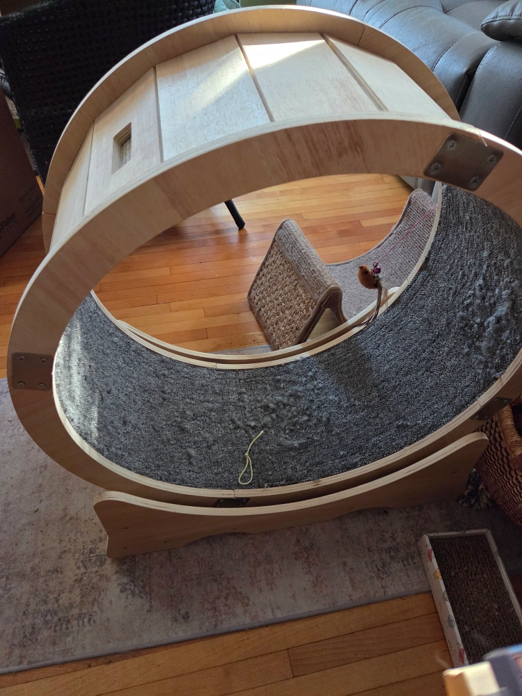 Selling a cat exercise wheel! It's a great way for your cat to get some exercise and have some fun. It's in good condition and ready for a new home. There is a scratching pad inside for your cat to enjoy! No space in my new apartment ๐