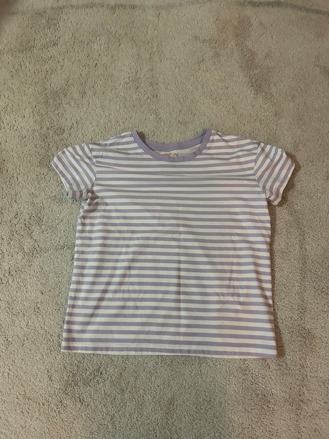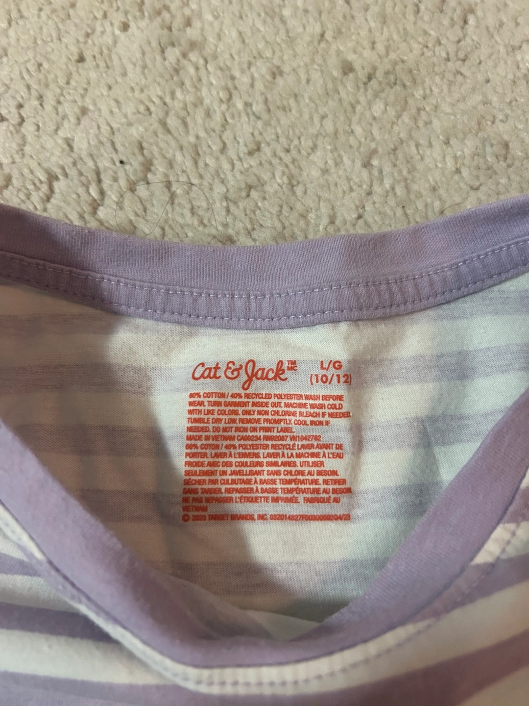 Cute Cat & Jack striped t-shirt in size L (10/12)! It's in great condition and ready for a new home. Made of 60% cotton and 40% recycled polyester, it's comfy and easy to care for. Perfect for everyday wear! gently used