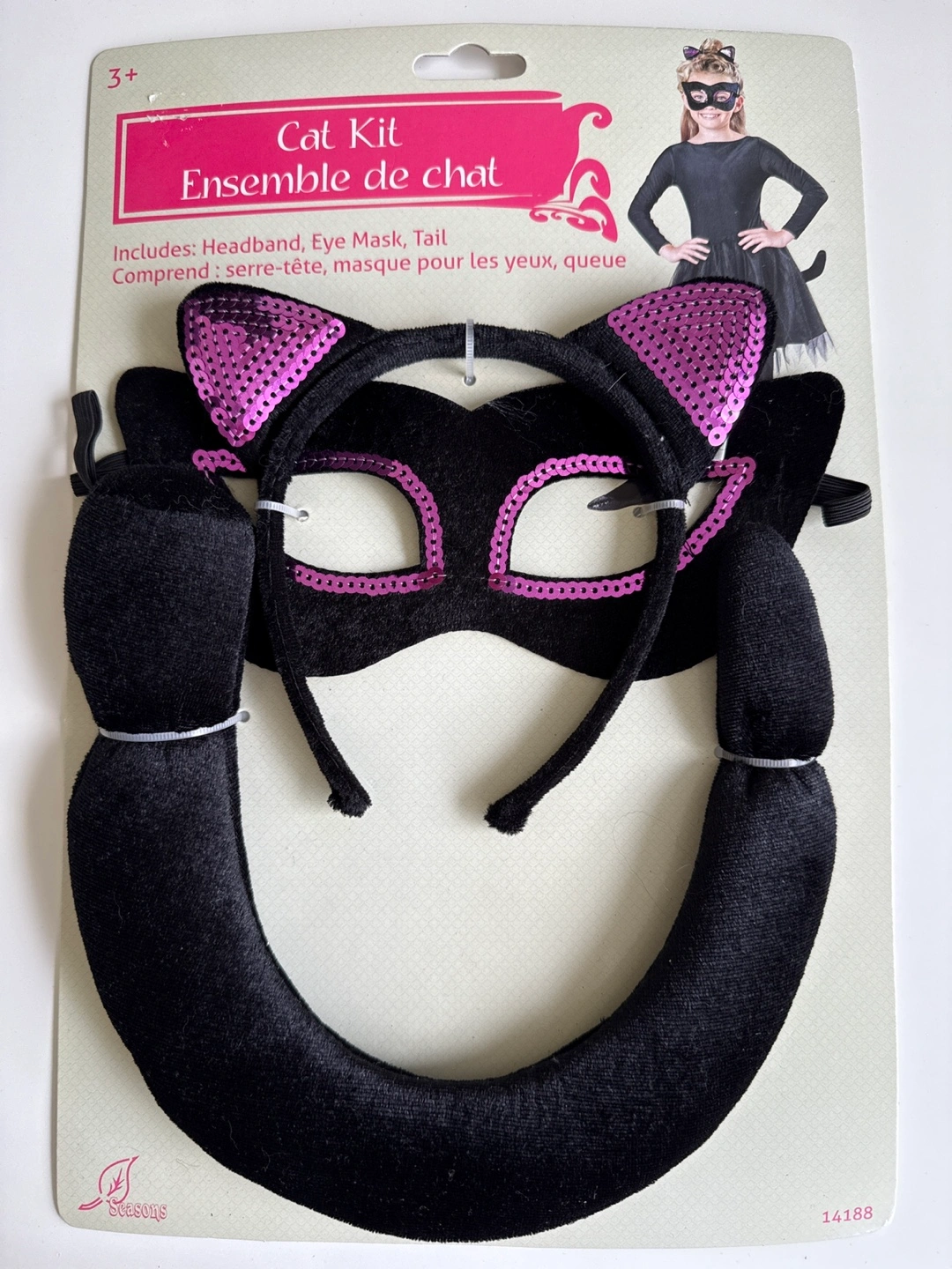 10Selling a brand new cat kit! This ensemble includes a headband, eye mask, and tail. Perfect for dress-up or Halloween!