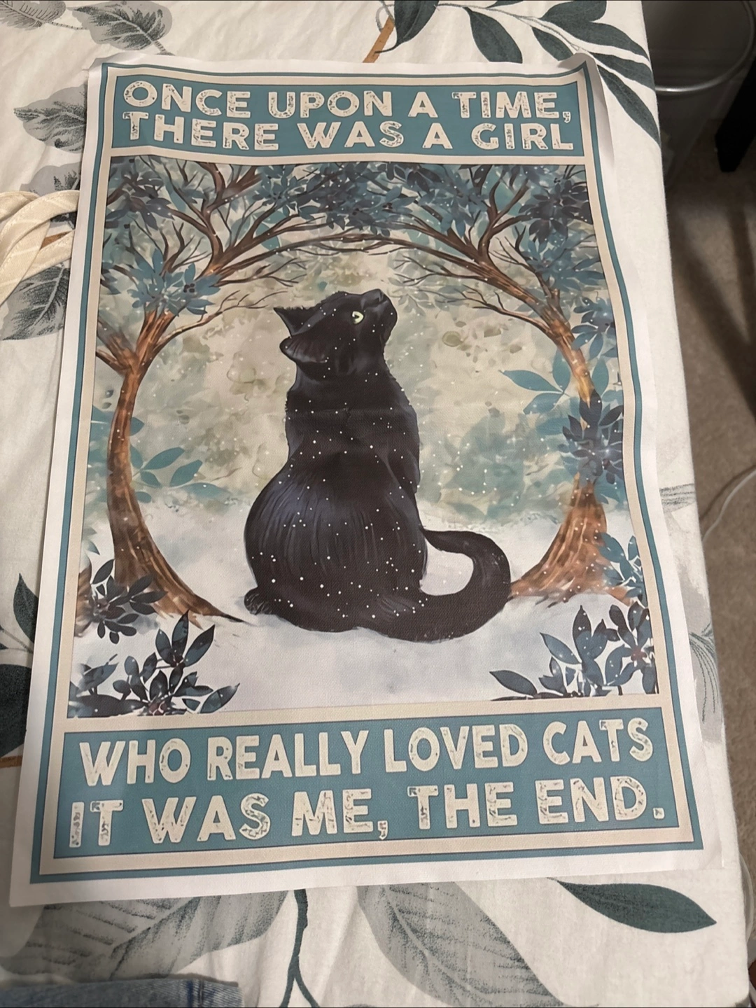 This is a cute poster featuring a black cat design. The text reads: "Once upon a time, there was a girl who really loved cats. It was me, the end"! It would be perfect for any cat lover's home