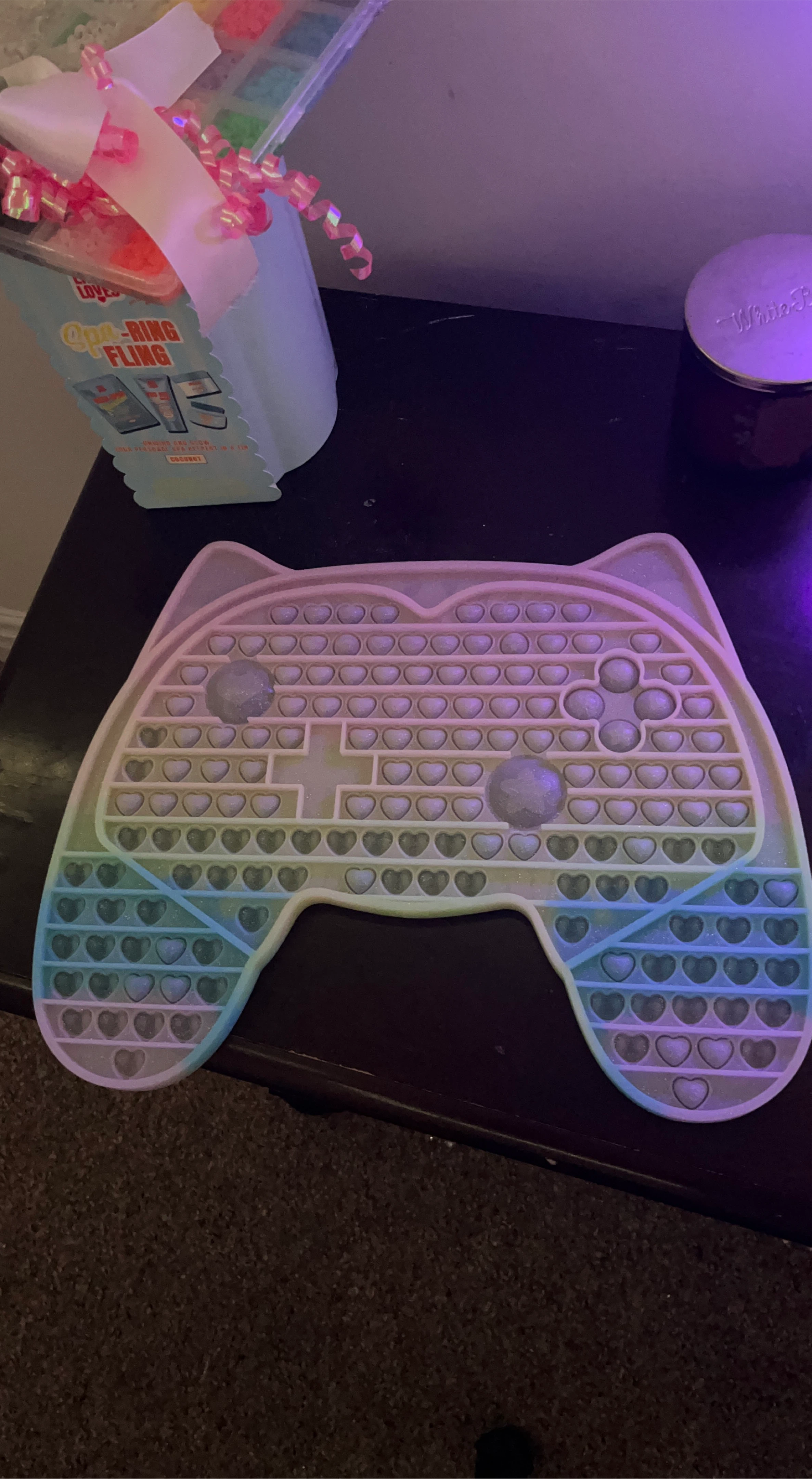 65This is a fun cat-shaped Pop It fidget toy! It's in great shape and ready for a new home. It features a rainbow gradient and heart-shaped bubbles for popping. Perfect for stress relief or just keeping your hands busy!