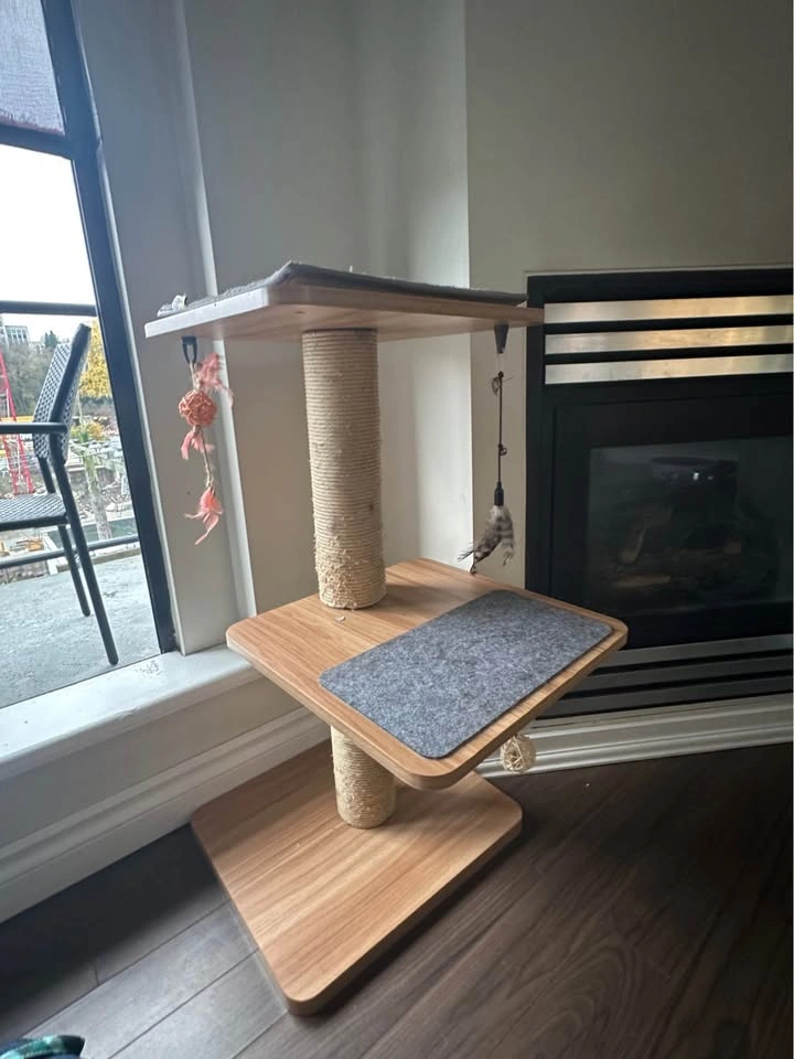 20Modern cat tree. About 3’ high. My cat doesn’t use it anymore. He’s 16lb large boy who just didn’t fit it well. He prefers the other two we have. Still in good condition. Great for kittens, or cats around 12lbs Coffee stain on top pad Pick up 8th and Cambie