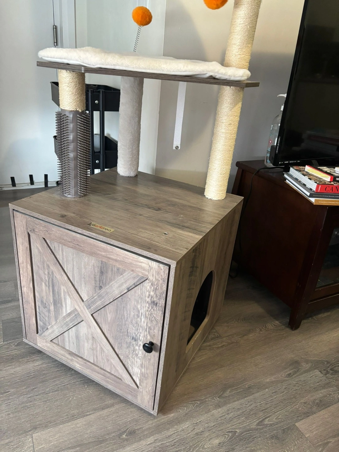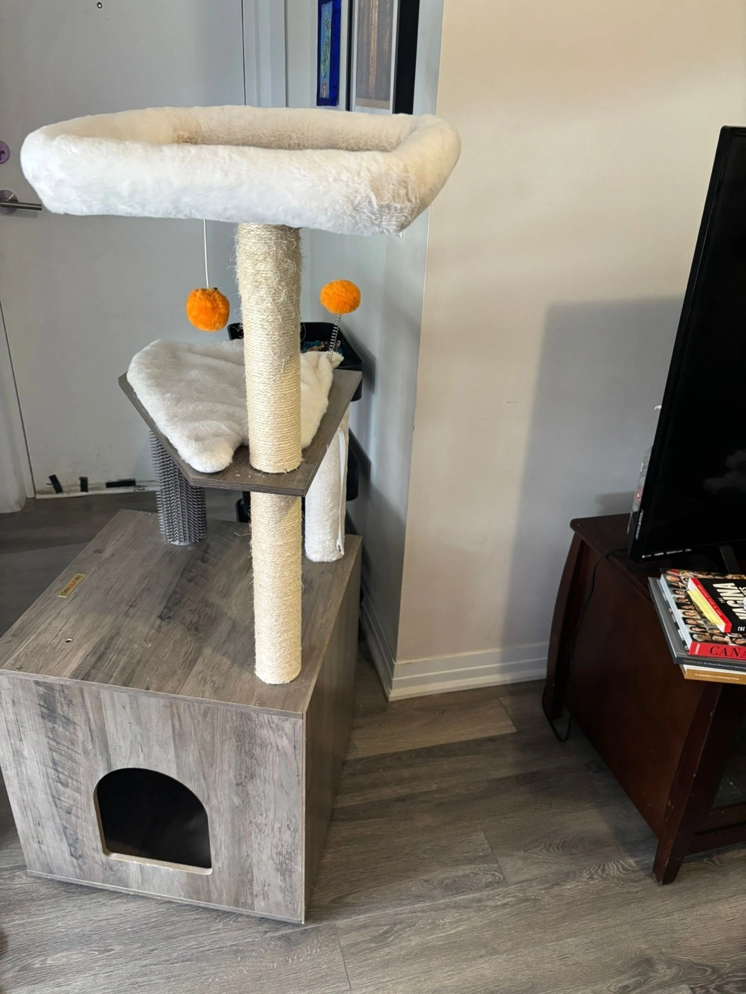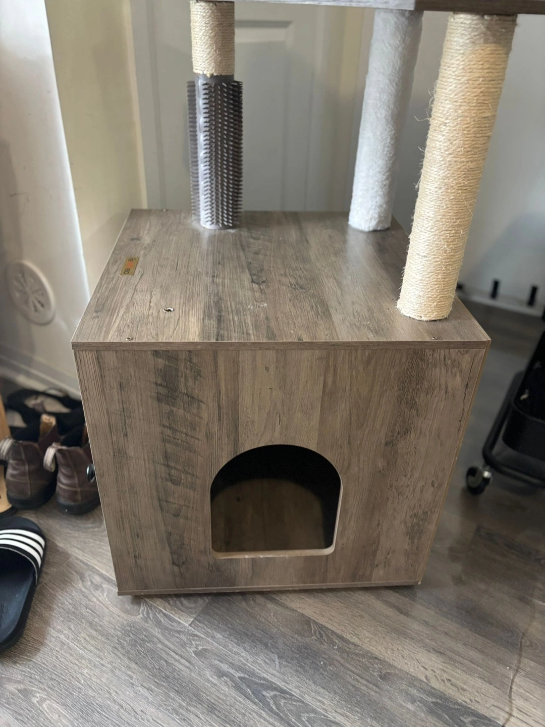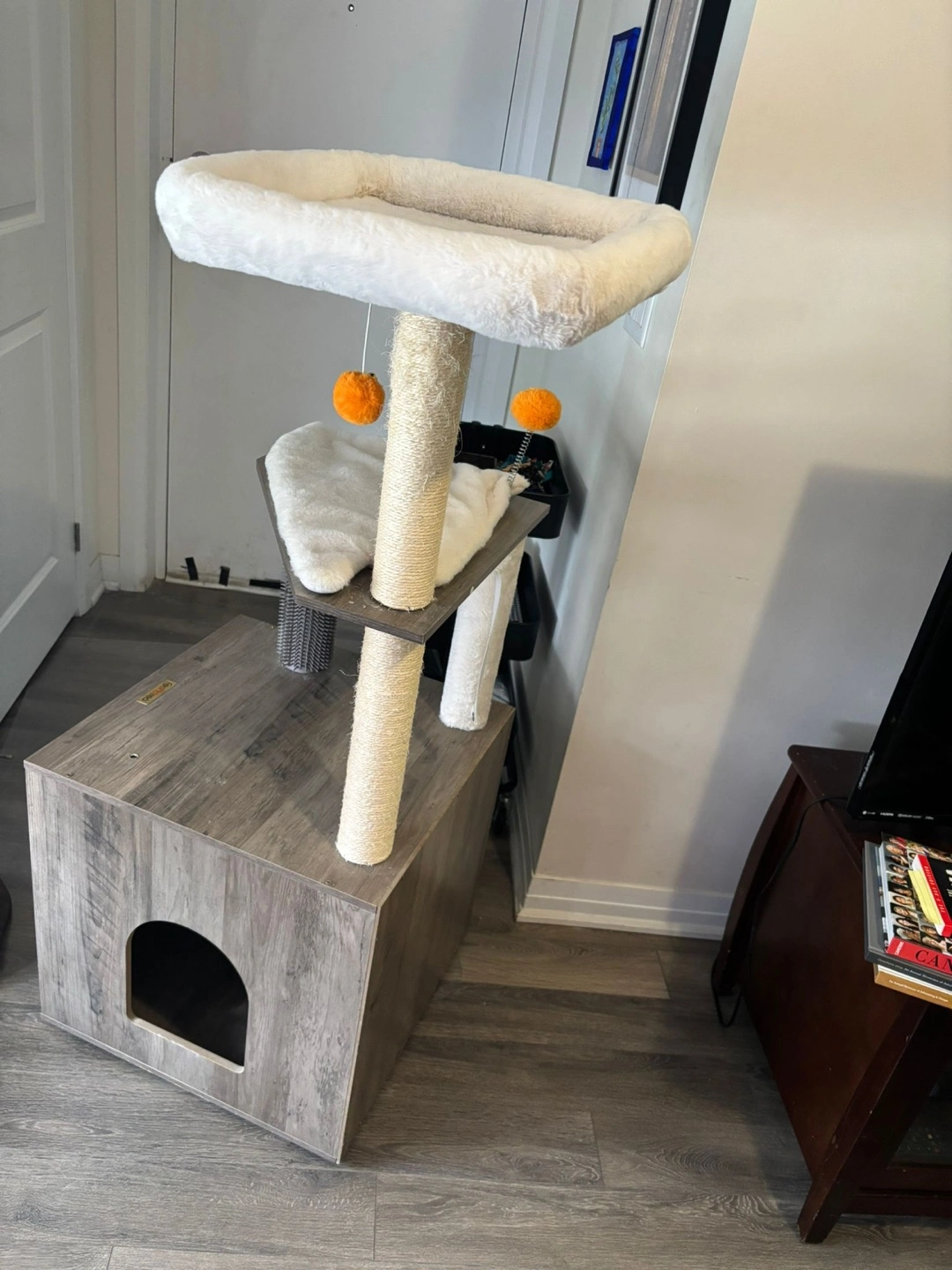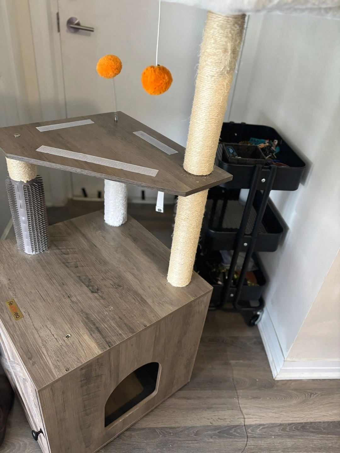 Solid cat tree structure. Features a house-like base and multiple scratching posts. Includes a comfy top perch, perfect for lounging, and dangling toys. Consider this cozy cat tree, a place for your cat to rest.